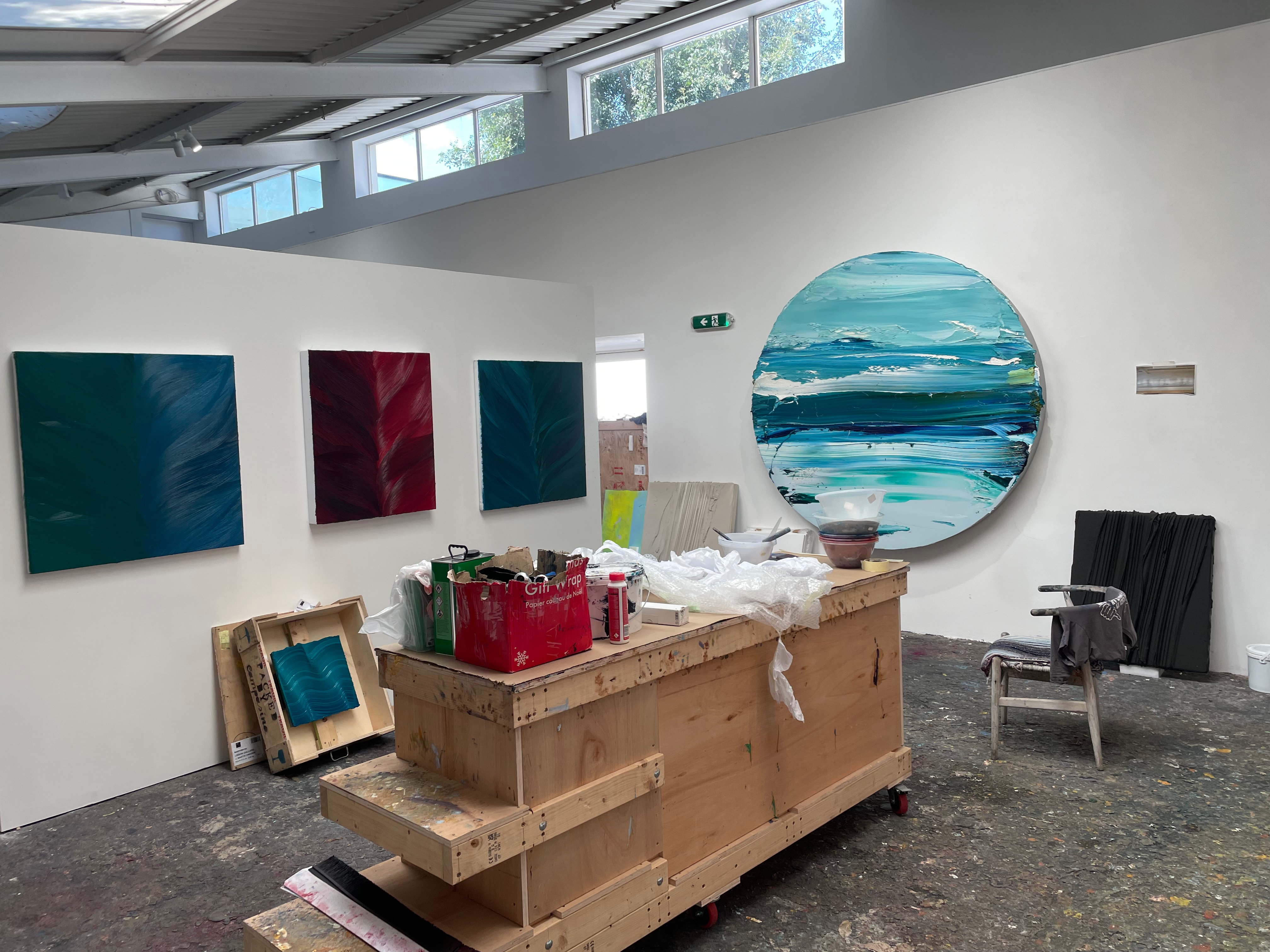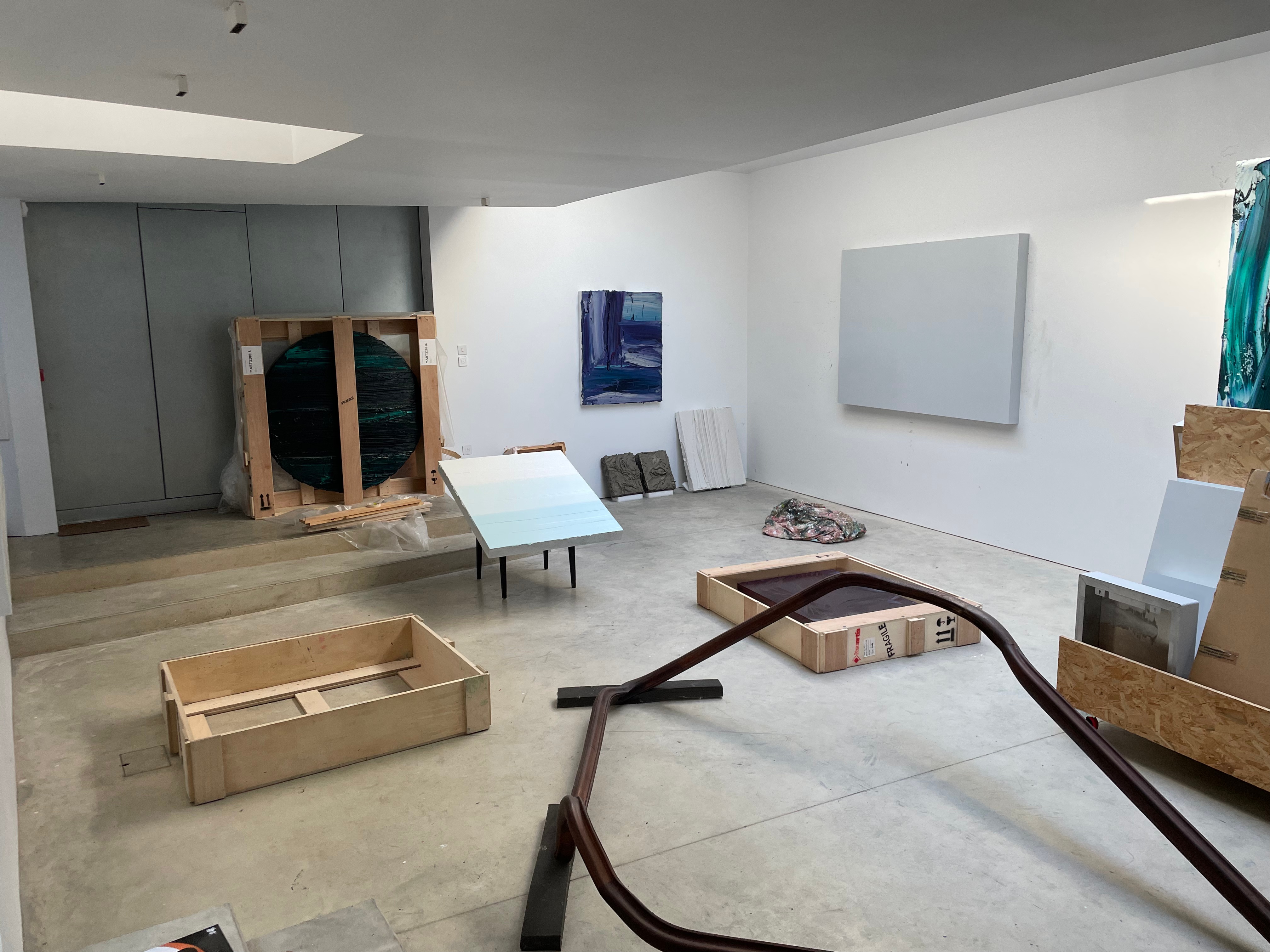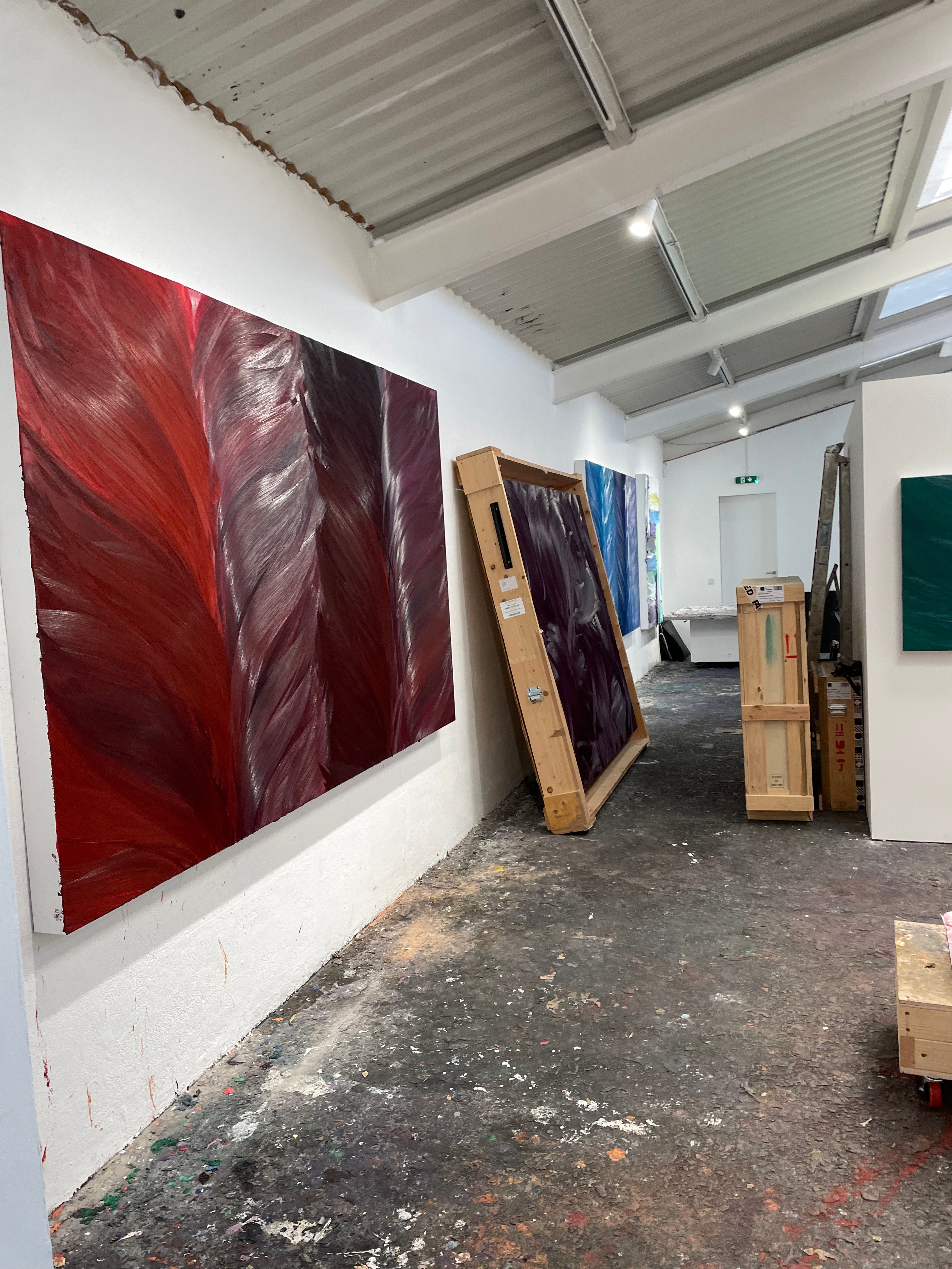 Over the Summer, I was lucky enough to be recommended for a job working as a studio assistant for the oil painter and sculptor, Jason Martin, by our screenprint technician, Ben Gooding. I will resume this position as soon as the course has finished. Jason Martin, a contemporary of Damien Hirst, is an artist based between Teddington and Portugal, creating these huge works by creating his own brushes, and painting with these beautiful emotional sweeps. I find a kinship with Jason due to the fact that a lot of his works have these ‘pseudo-horizons’, that make the pieces seem like landscapes. My main interest in Jason’s work comes from his process. Some of his pieces are painted with an impasto acrylic gel medium, that is applied thick onto the aluminium panels that he uses as surfaces. These sculpted panels are then dried and sprayed with hundreds of layers of a ‘jacket’, that he calls ‘pollinating’ the surface. The result of this is an almost flocked looking very organic base. These works are then either sprayed with rich pure pigments, or in some cases coated in gold or silver through electrolysis, as in the case of the picture on the far left. Jason’s innovative approach to creating his work really excites me, and I’m really happy to be a part of his artworks. Working in this professional space, and being introduced to Jason’s clients, galleries and other staff such as photographers is leading me to forge really exciting connections in what I was expecting to be a very lonely and scary post-MA world of art. I am also learning invaluable skills, such as how to package his artworks in crates, and am quickly becoming very good at hanging work and establishing eyelines. This work will be a very exciting step forward for me post-MA and I’m really excited to carry on working for Jason in the future.