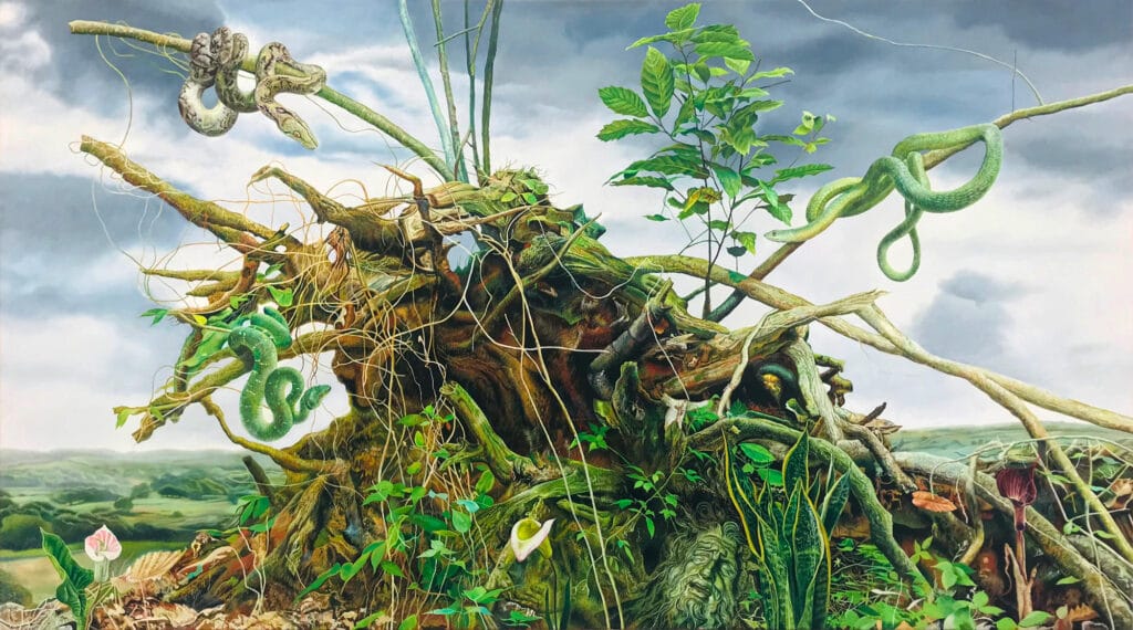 I really enjoyed a lecture presented by Mark Fairnington on realism. Fairnington’s work itself was fantastic, hyper-realistic to the point of almost surreal, his vibrant, unnatural use of colour really stood at odds with the obsessive detail utilised in his large-scale paintings. This notion led onto his discussion of realism, and its truth. Is hyper-realism falsehoods masquerading as truths, it is ‘speculated fiction’ presenting itself as observed fact. Fairnington quoted fantastic critical debates, such as ‘The Vast Extent of Seeing and Not Seeing Further”, by Lavinia Greenlaw that really helped in my own critical reflection around my own work. Fairnington’s other work on taxidermy was also really interesting. I drew parallels between his own discussion of stilling life in taxidermy to my work on the landscape and stilling nature, Fairnington had a fantastic selection of references that were beautifully worded within his lecture and quoted Rachel Poliquin’s, ‘The Breathless Zoo’, stating “[taxidermy] is the conquest of mortality over a semblance of life in death”- which I believe is just a beautiful way of articulating the point. My favourite part of Fairnington’s lecture was towards the end when he showed us some of his more recent works, depicting tangled and knotted living forms, bursting with various forms of exotic life. These sottobusco paintings used the undergrowth as a figure within the painting, and this is something I tried to take into my own work, with the stone cairns in my mono print depicting the summit of Brown Wardle Hill. Fairnington’s subsequent discussion of his own recent struggle with cancer, and his acknowledgement of these paintings as subconscious self portraits was something that I found really profound and touching.