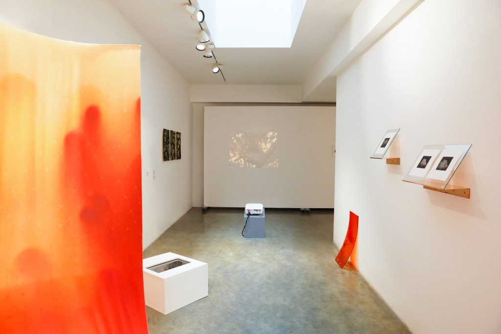 I was lucky enough to have four pieces displayed in the Summer Show. Two of these pieces were located downstairs in the Student Union Gallery, just by the foyer of uni. I decided to show three pieces on these lovely copper and glass shelves. The final prints were on Hosho Paper, so they had this lovely thin and floaty feeling. I fixed them onto the glass with a tiny amount of Yamato Nori Paste. The two shelves were displayed offset from each other, with one a little higher than the other two, to really get that upwards floating feeling. I was really impressed with the curation of this downstairs space and I love the fact that the orange colours of Lizzie’s work, opposite and next to my piece, really spoke to the copper I had used. Jirapak’s work on the back wall, with it’s golden reflective movement also had a really nice visual language crossover with my own work. I recieved great feedback over these pieces and I was really happy that people had as much fun looking at them, as I did making them. It’s really exciting to have these prints displayed in such an interesting way, as I believe I won’t have many opportunities in the future to present pieces like this in a group exhibition setting. I look forward to displaying this same setup elsewhere, most likely with new and improved cloud prints instead of the ones featured here.