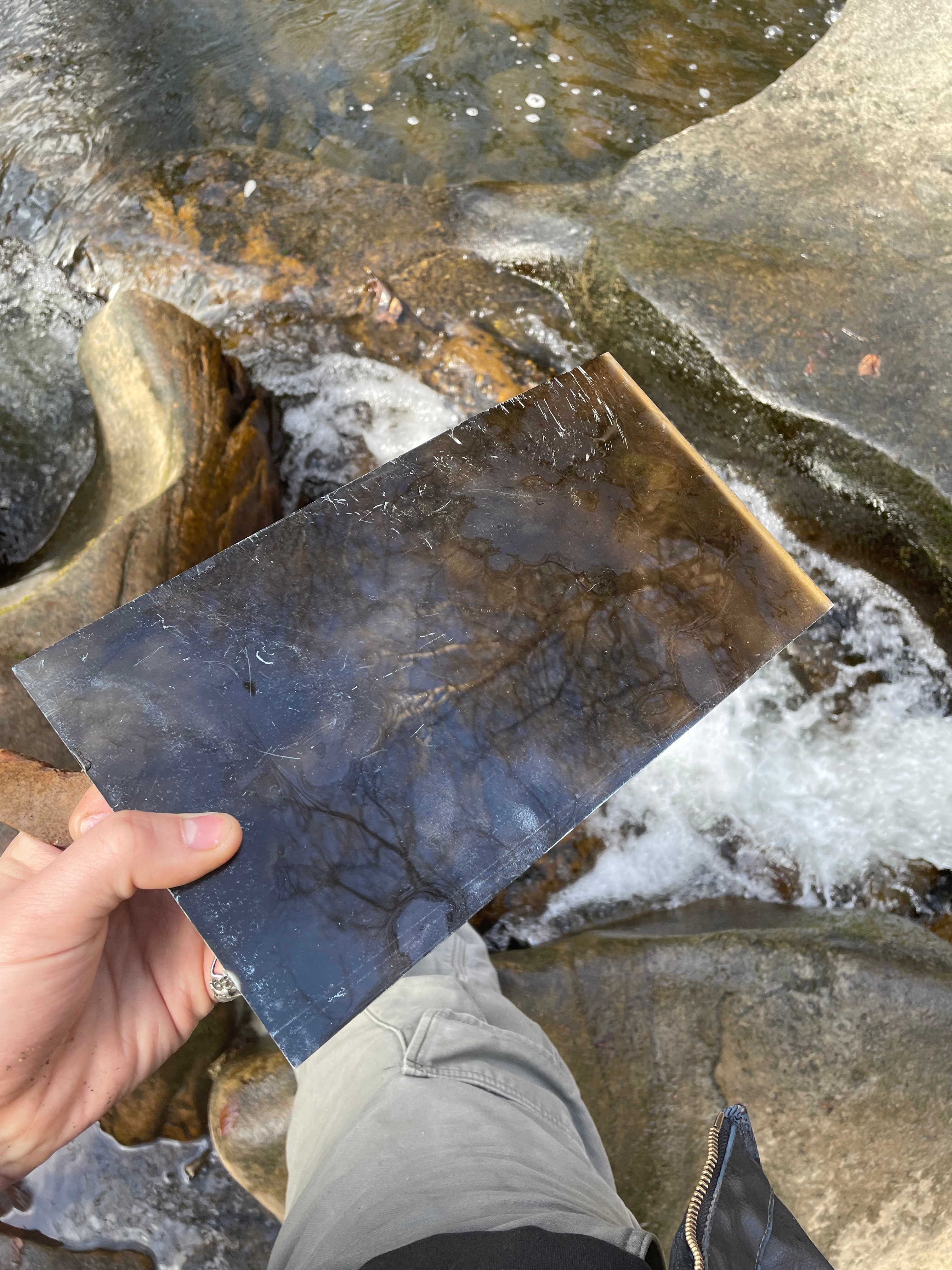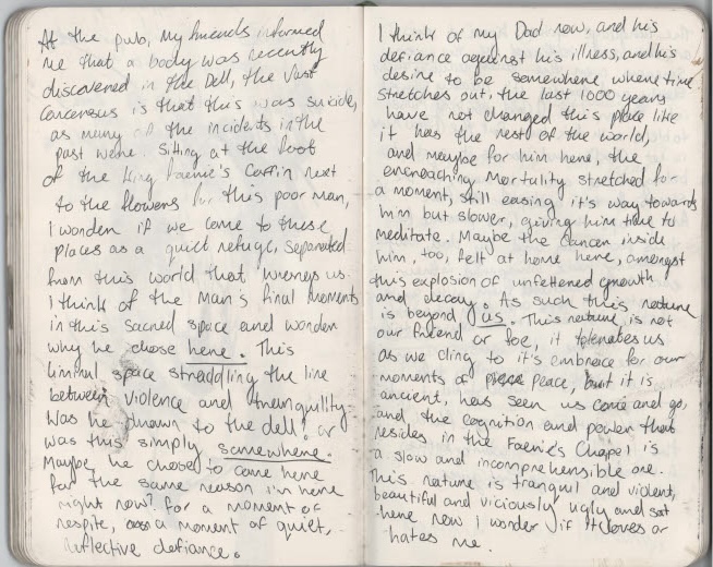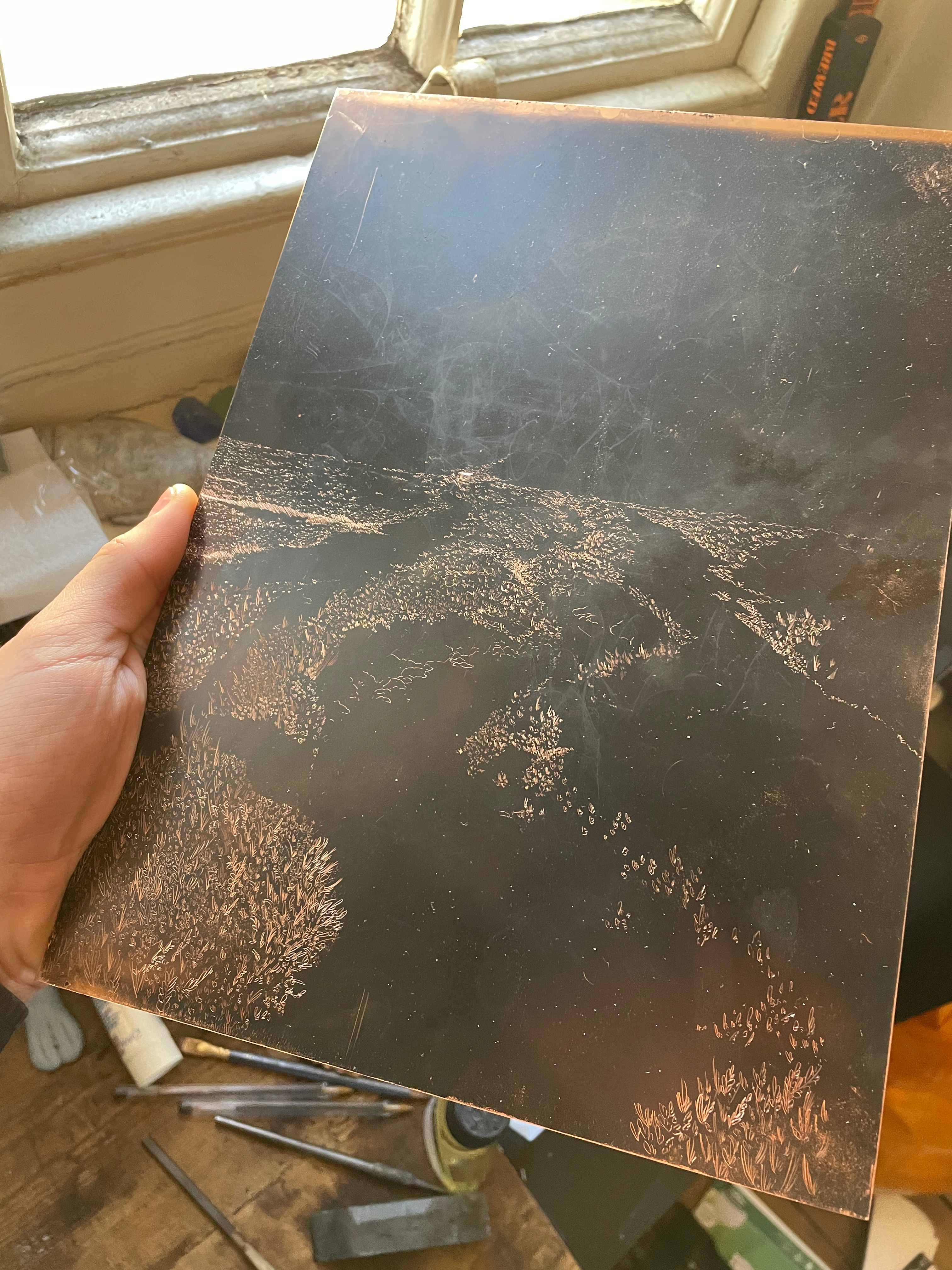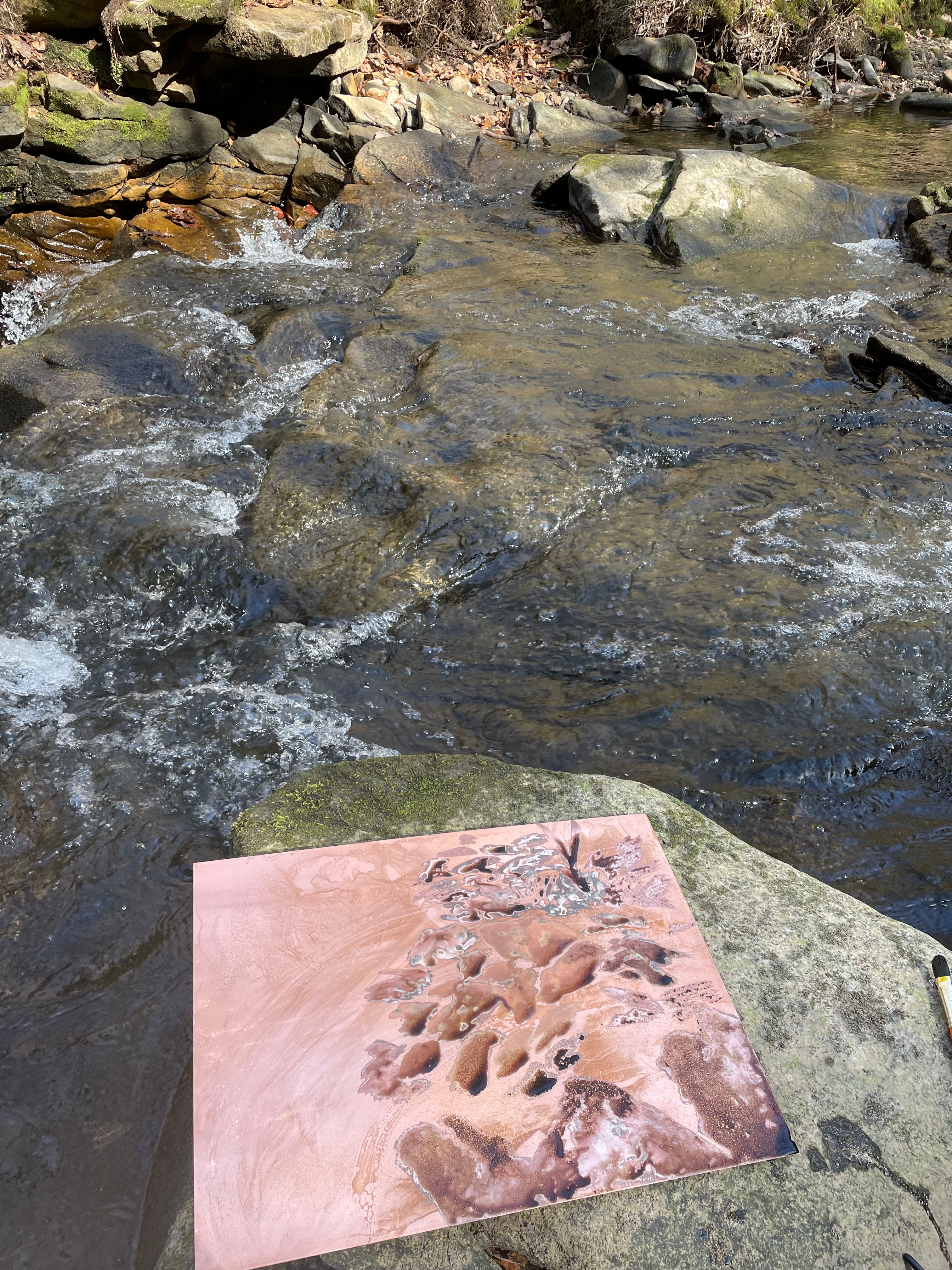 I managed to find a weekend to return to the Dell and was confronted with the most beautiful weather, something that doesn’t often happen in the Pennines. I arrived late on the first night and went to our local pub with some friends to celebrate a birthday, I told them about my intentions to do some drawing down in the Dell and they informed me of a suicide that had occurred the day before my arriving. Sadly, Healey Dell has become a hotspot for local suicides, since I can remember there were stories of people who had thrown themselves from the viaduct to meet their watery end in the Thrutch below. But this time, something really brutal had happened, a man had thrown himself from one of the rocks into the waterfall. The next morning I descended down the stone steps from the road into the Dell and immediately saw a bunch of dried up flowers on one of the rocks. This really gutted me to see, the place that I love so much, that offered such hope and brightness for me, was the place where someone felt their last moments, just tens of hours before me being there. I had an urge to take out my sketchbook and write. This writing was for my own personal use, and wasn’t meant to be shared, but as I wrote in-situ, thoughts and feelings began to spill out on the pages and I found that I couldn’t stop. On the train home I read my notes and came to the realisation that I’d said what I’ve always wanted to confront in my work, something that feels too raw and painful to say out loud. I’ve always struggled articulating these complex feelings about why I make the work I make, but through this spontaneous writing in these spaces, it feels easier to articulate myself. I’ve included below the excerpt from my sketchbook as these words feel to me irreproducible. I chose to sit on the rock where the poor man had so sadly been standing and drew what he may have seen before taking the plunge into the violent waters of the Thrutch. I intend to explore this drawing on true grain further by exposing it onto photo etching plates and working back into it. I also left a plate in situ for a few days, but sadly this had washed away when I returned. I wasn’t completely annoyed by this, it feels like it came as a sign to leave the waterfall etched plates for now, and explore something new. I also came with a large plate of aquatinted copper and a bottle of ferric chloride to try and do some more spit bite in situ, after my previous failed attempt. I assumed that because it was a much warmer day, I’d have much better results than last time. I also left the acid on the plate for much longer than I did with my last experiment, to try and get a stronger bite, I spent around 3 hours spitbiting this plate, allowing the acid to really take a hold, but I was saddened on my return to London that the plate printed with no tone whatsoever. Despite a lot of things going wrong on this trip, the realisation about my writing was one hundred percent worth the visit, the two pages that I took away became really important to me in the genesis of new work.