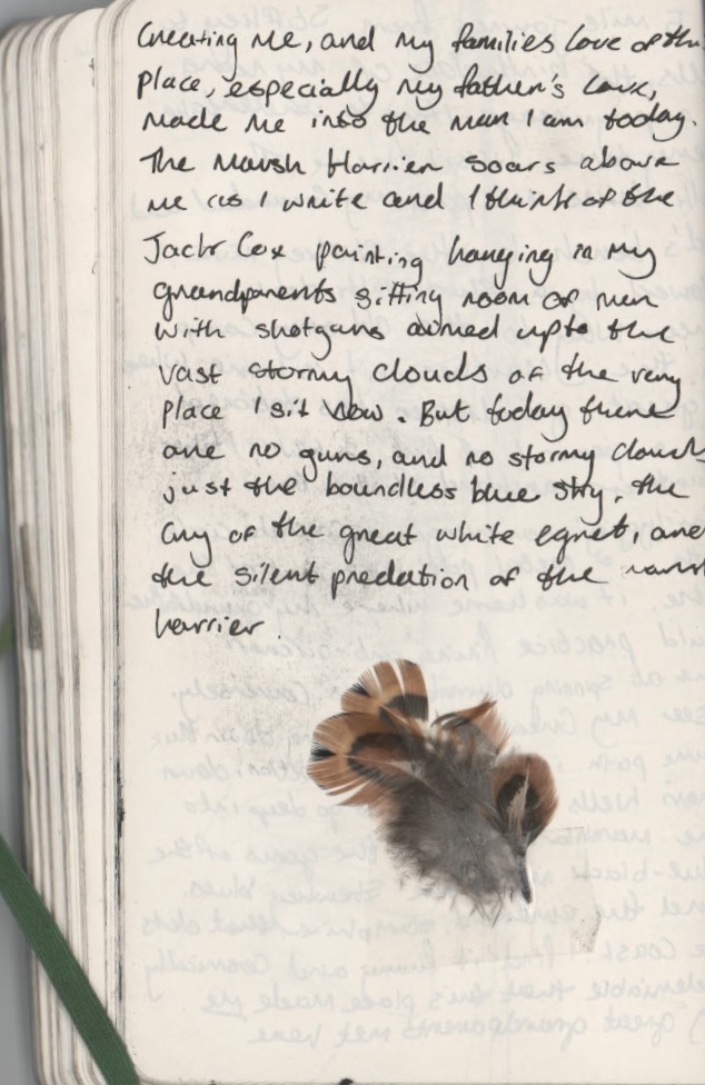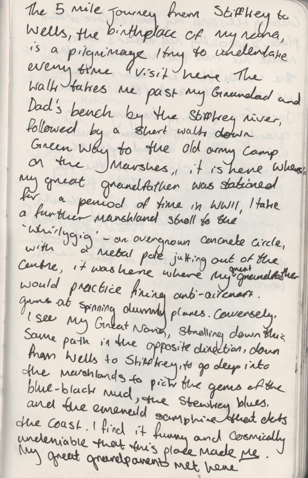 I did some more writing on the marshes to try and nail down even further how I felt about my work and my reasons for making it. The first sketchbook excerpt is from the first night I arrived, waiting for the sunset to roll in on my dad’s memorial bench right on the edge of the marsh. This night felt particularly emotional for me and I realised that it was my first time sat on that bench fully alone, without any family around. I suddenly felt this great feeling of release, I felt that I was finally allowed to sit down and process my emotions alone, on a silent stretch of marsh. The other two pages come from a much more positive mindset the morning after, on a sunny walk to Wells-Next-The-Sea from Stiffkey. I don’t want to talk too much about my sketchbook writing as I feel they should stand alone and express themselves, moreso than I can sit down and type on a computer about them.