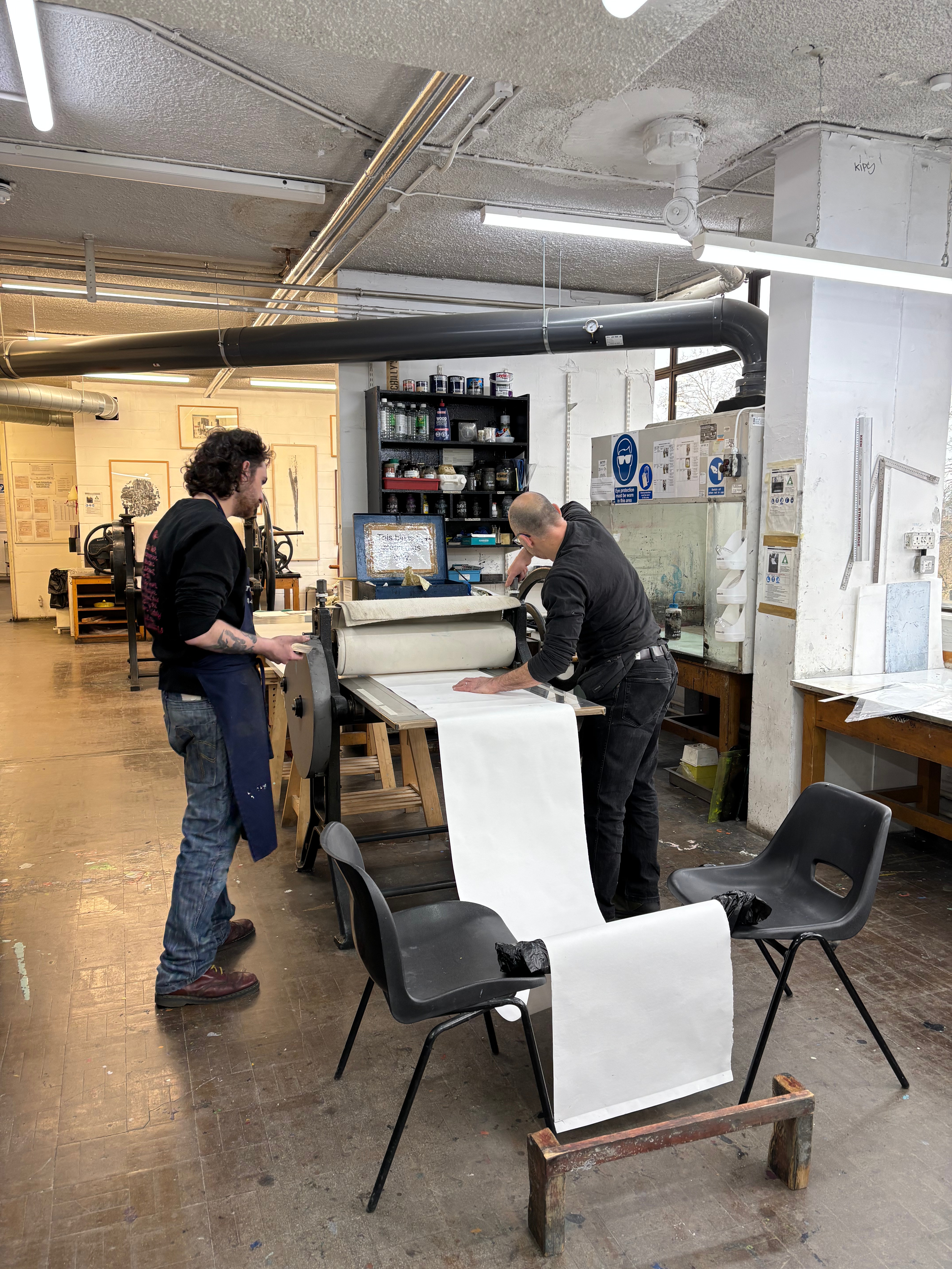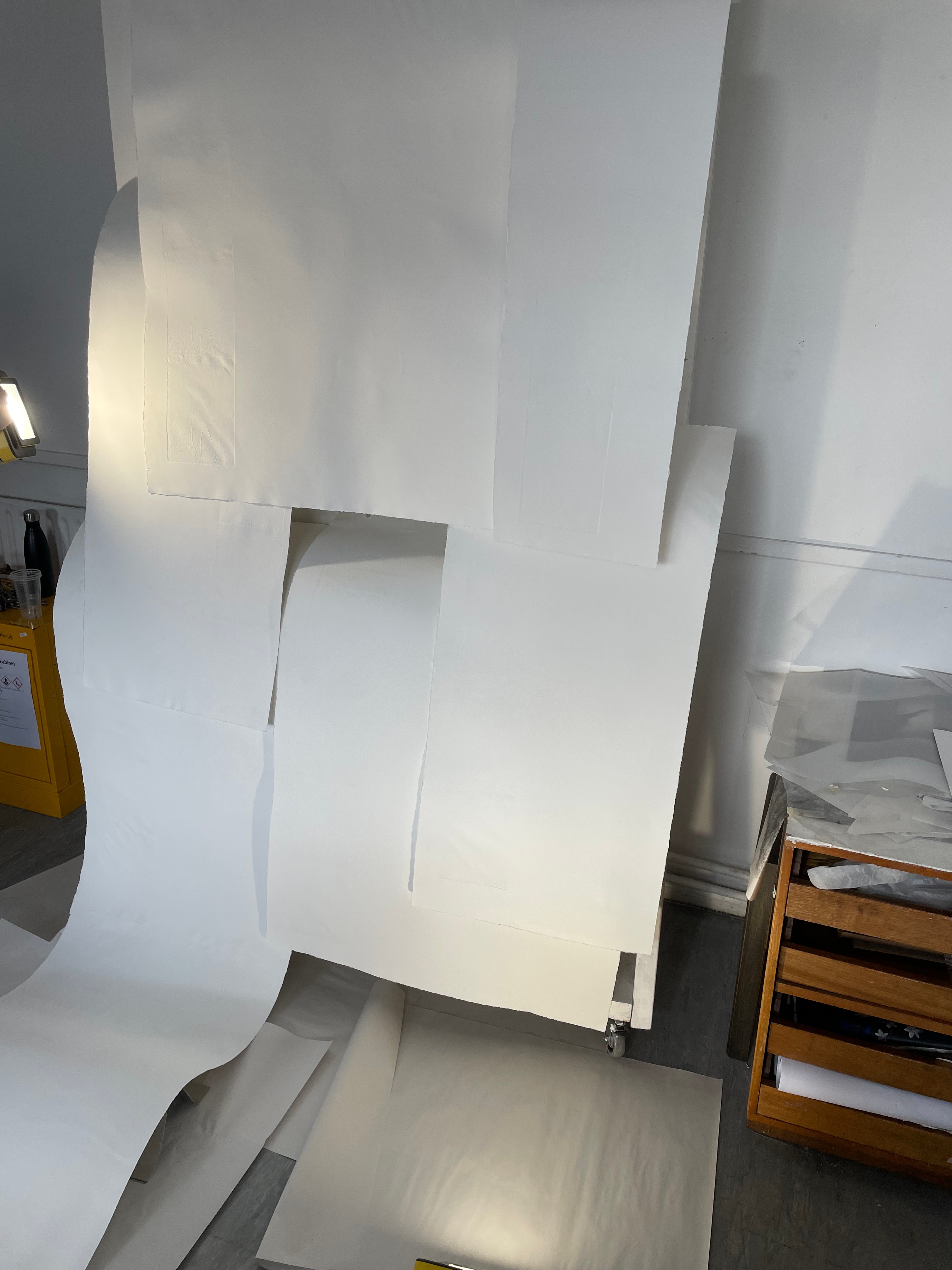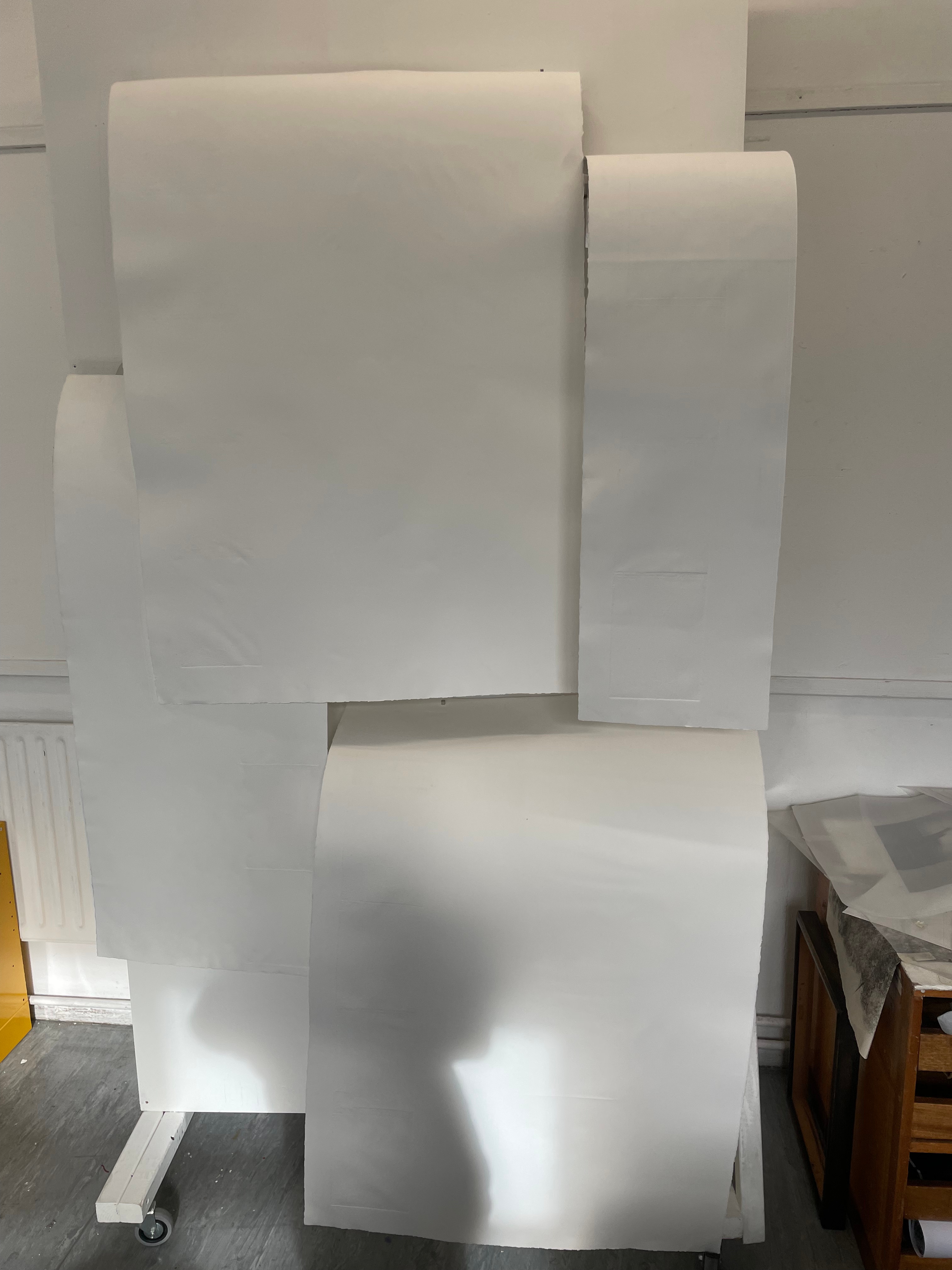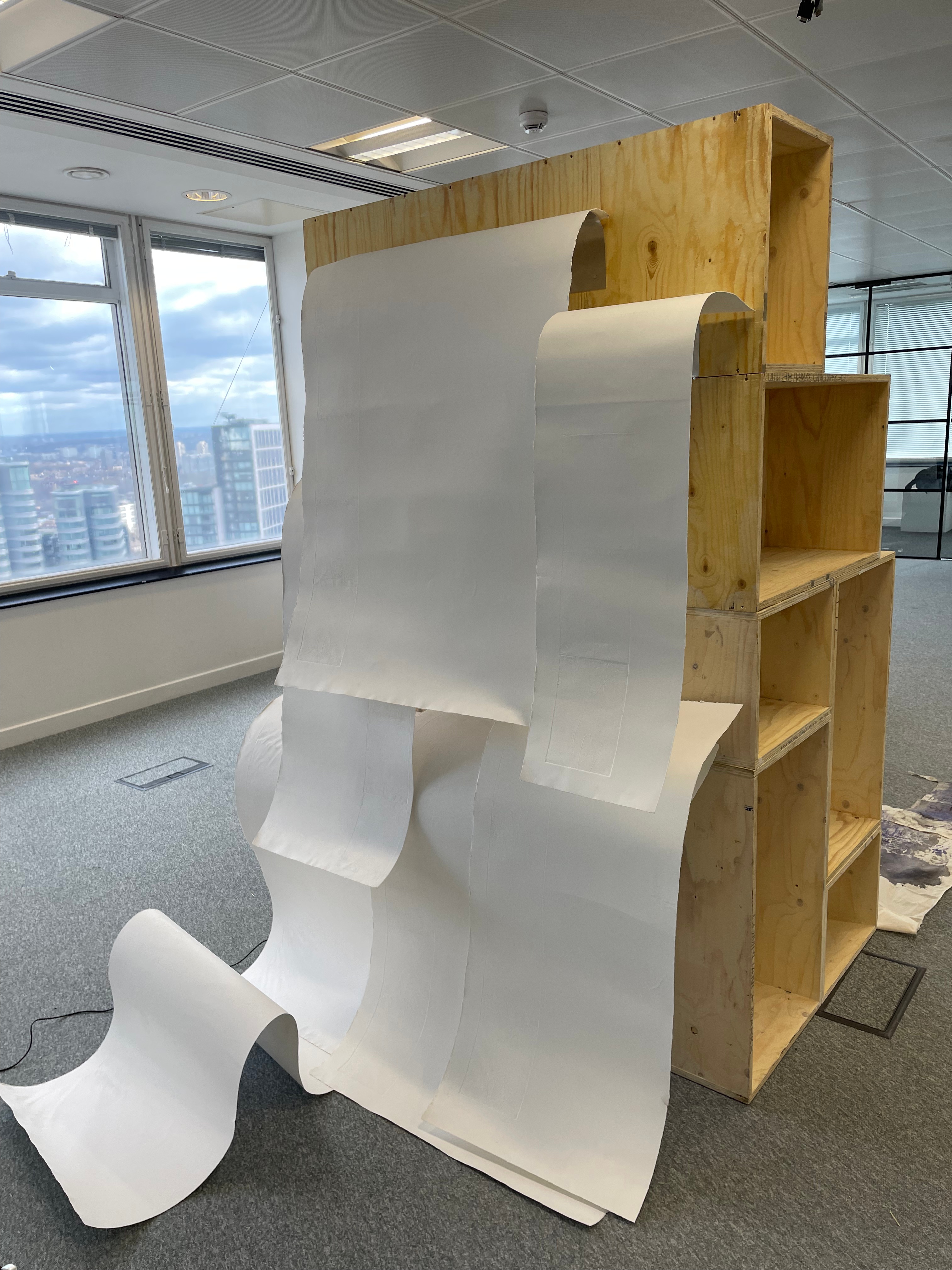 I decided to use several sheets of tub size Somerset of various lengths and widths, cascading over one another. This time in printing, I decided to use the Beevers Hydraulic Press as I’d had great results with the emboss before, and Pete Roberts told me that we could remove the guard rails on the back of the press to accommodate longer sheets of paper. We did lots of experimentation with printing the plate and devised a jig wherein the plate would sit in a marked square of acetate, while the paper would rest on aluminium rails to ensure perfect registration. We also encountered an issue where the pressure of the press would destroy the very subtle emboss on the previously printed impressions. To accommodate for this we used a very heavy piece of foam, to pack the press, meaning that pressure would only be applied to the area of the paper where the plate sat. This led to much better and more consistent embossings, that were registered perfectly. The choice of Somerset was also very helpful as the thick paper could handle the constant handling and rewetting, whilst also providing the means for a lovely emboss. Once all the elements of the piece were printed, it was time to assemble them. I bent pieces of aluminium into forms that would allow the paper to cascade gently over each other, creating the effect of the waterfall where the plate was created. After several revisions in the placement and form of these aluminium brackets, I finally settled on a configuration that would give the very ethereal delicate feeling of the breathy action of the waterfall against the plate. I chose to have some of the paper cascading onto the floor, invading the viewer’s space when looking at the piece. Once the rough form of the piece began to take shape, I became a bit worried about the light in the Millbank Tower. On a site visit a couple of weeks before the installation, I had noticed that the light was very clinical and artificial in the space, it was also very top-down, so it wouldn’t do a good job of showcasing the very subtle impression of the plate on the paper. I used some spotlights to offer directional diffused lighting to the emboss, and this really illuminated the subtle effect I had created on the paper. I then tried to book some lights from the Loan Store to use for the exhibition but was denied as they can’t offer them for exhibitions, which I found quite annoying. I decided that I would have to trust in the positioning of the piece in the space and its relationship between the windows and overhead lights to really let the emboss shine.