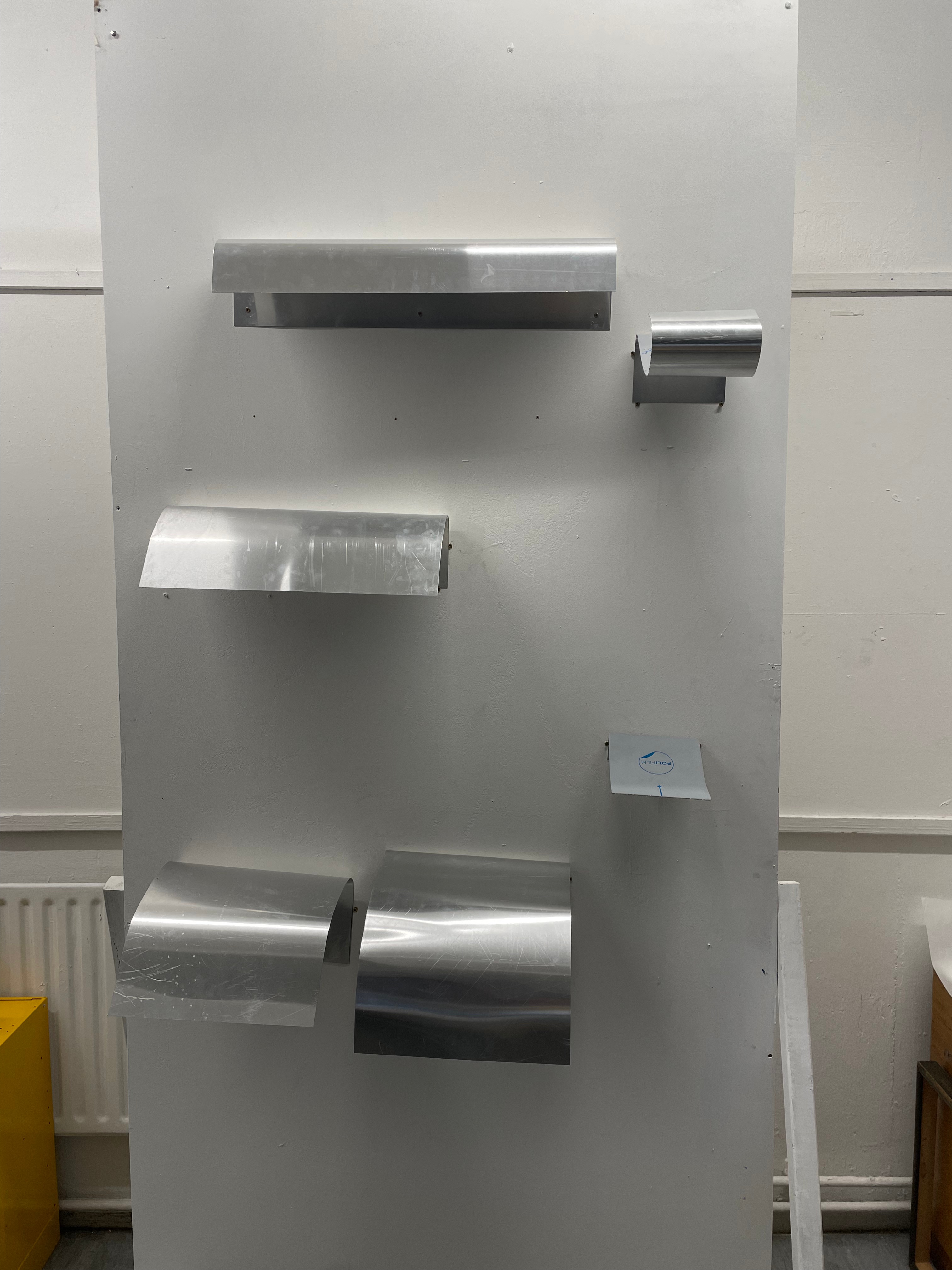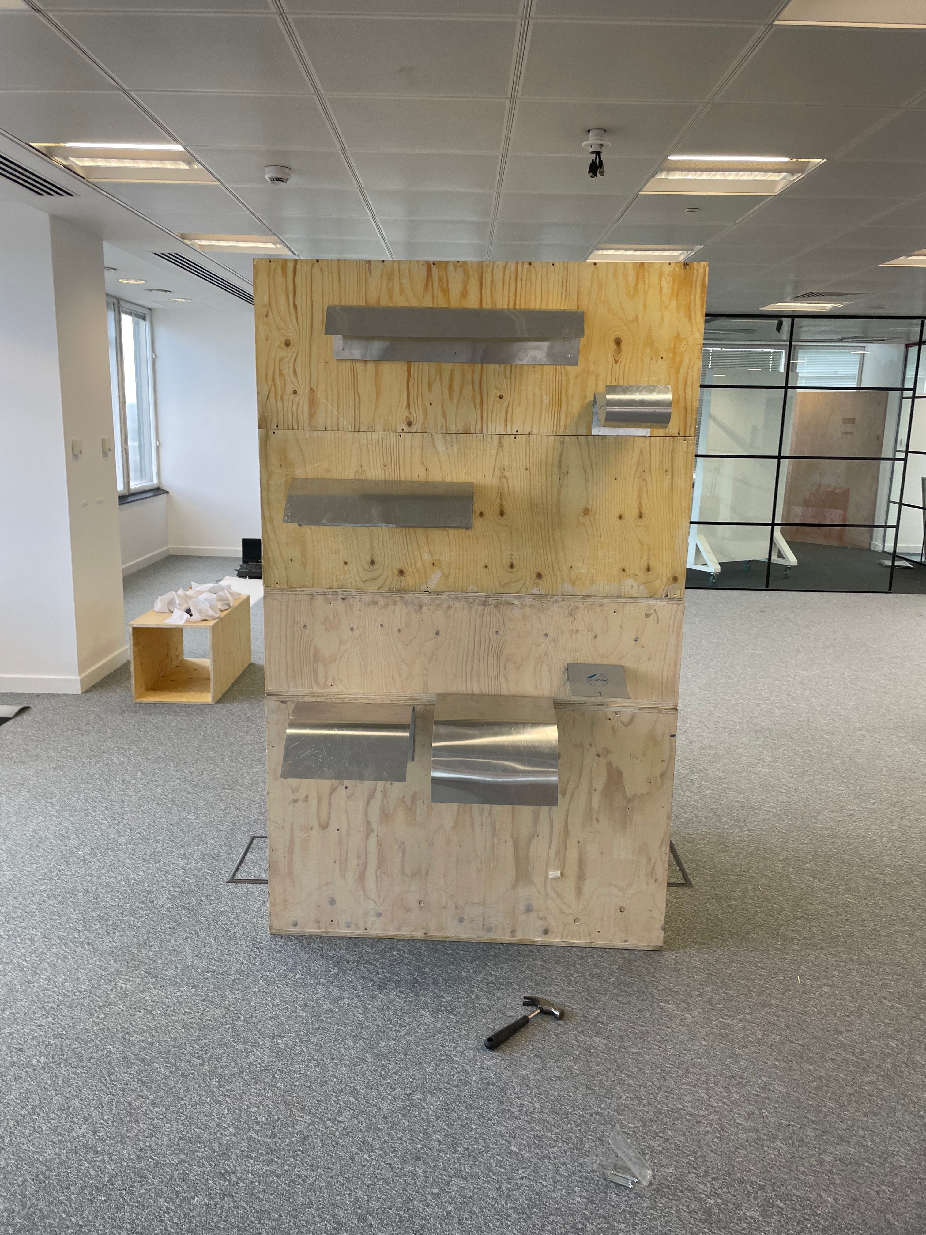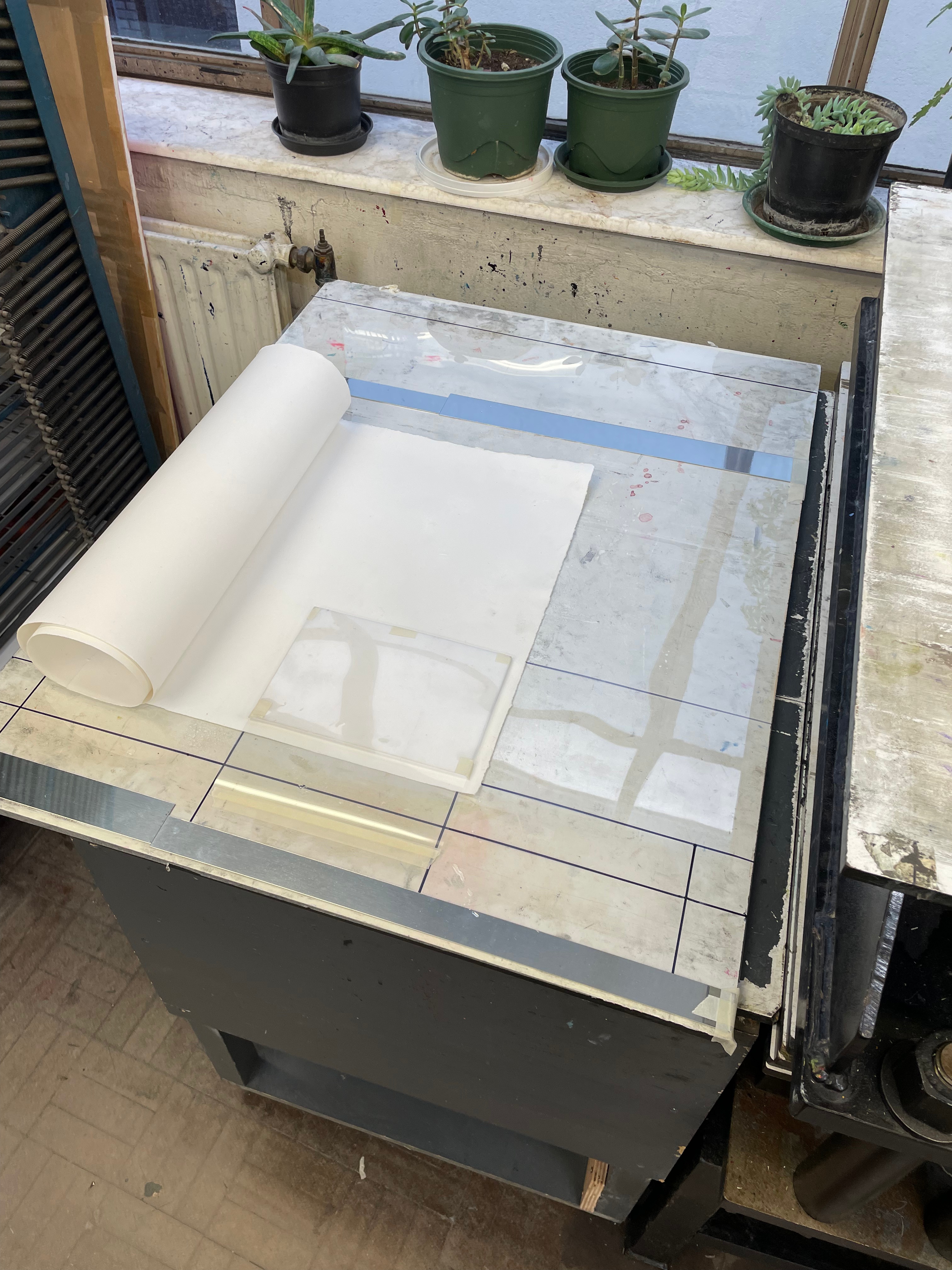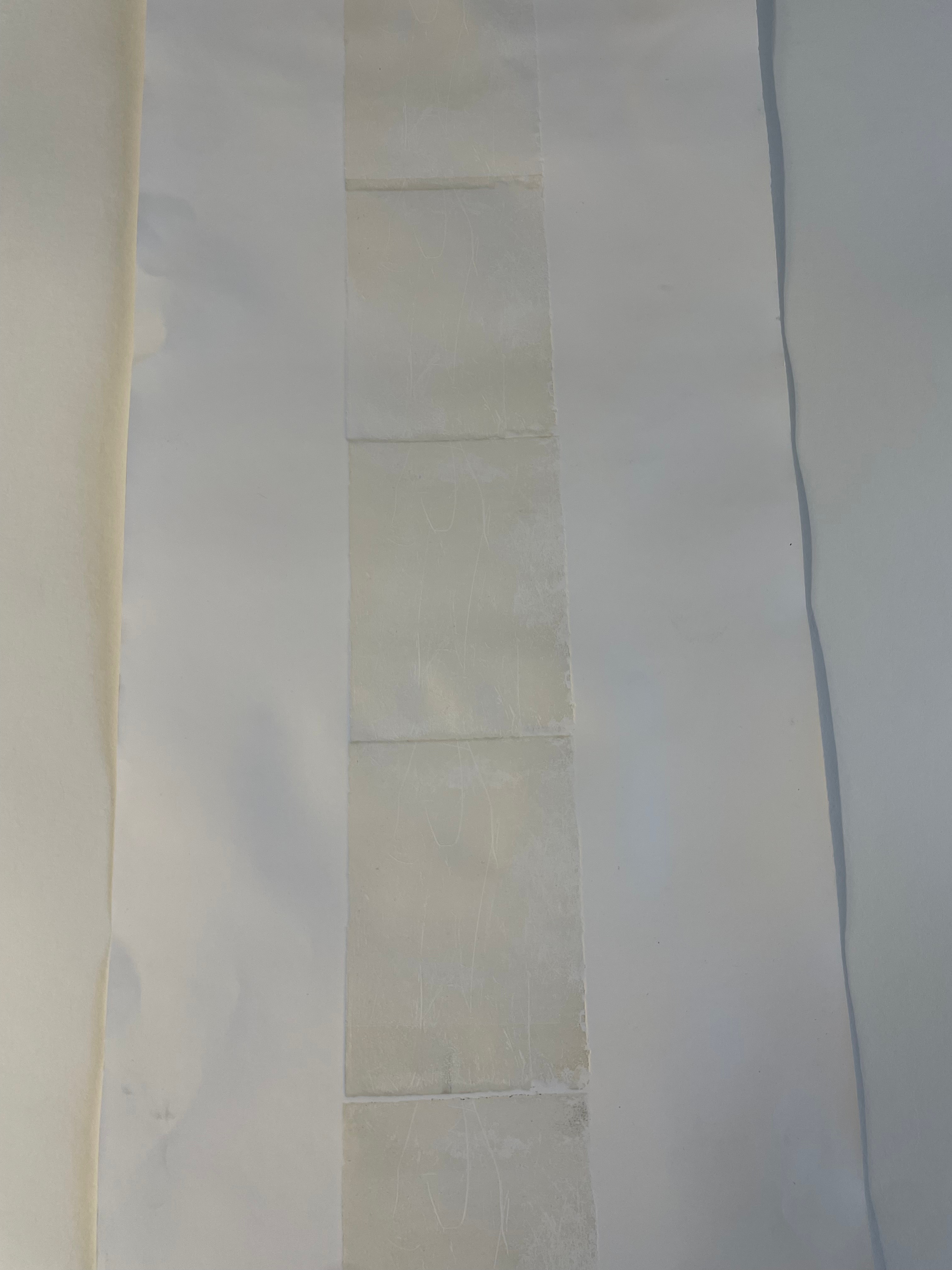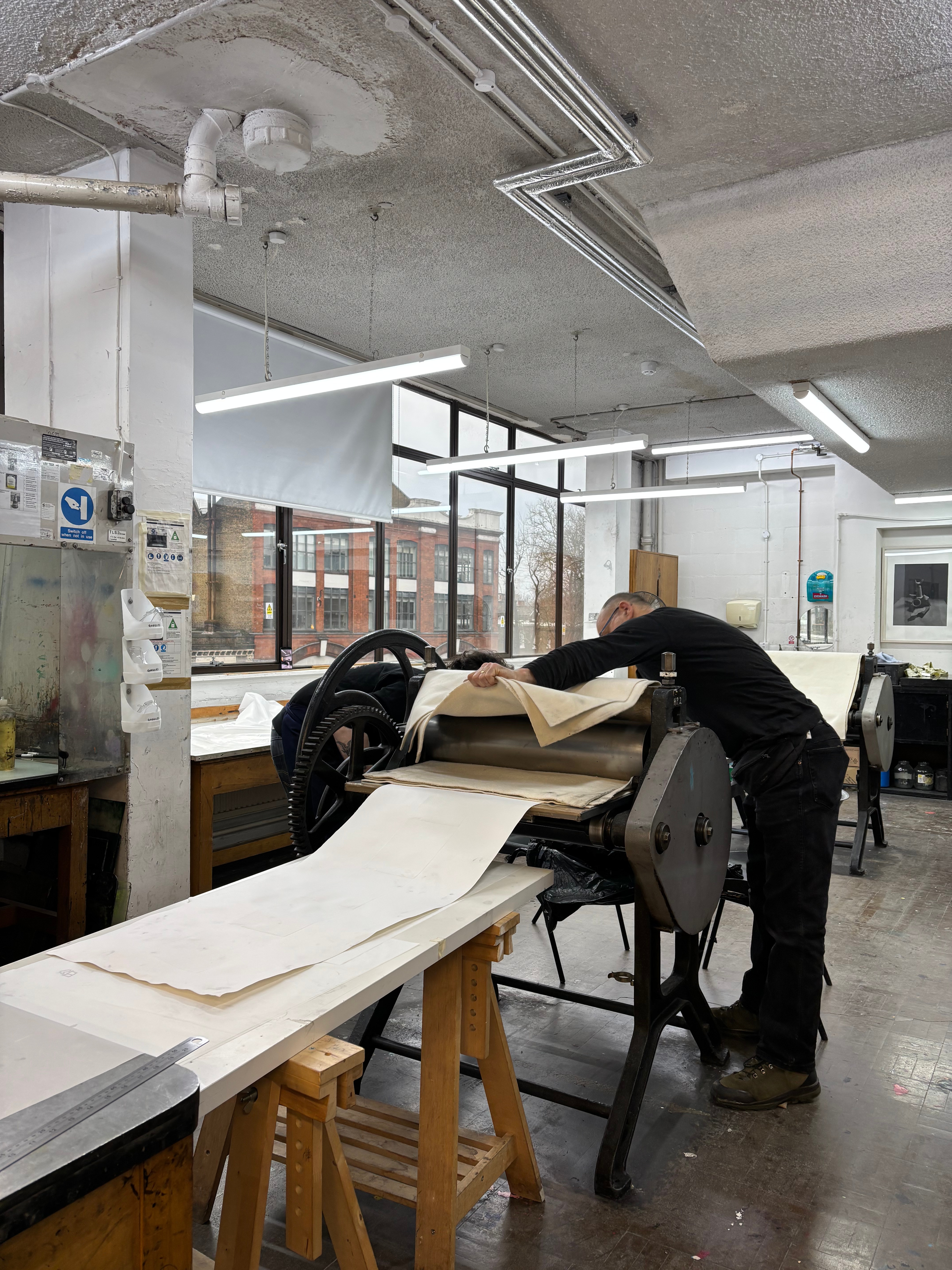 I decided to use several sheets of tub size Somerset of various lengths and widths, cascading over one another. This time in printing, I decided to use the Beevers Hydraulic Press as I’d had great results with the emboss before, and Pete Roberts told me that we could remove the guard rails on the back of the press to accommodate longer sheets of paper. We did lots of experimentation with printing the plate and devised a jig wherein the plate would sit in a marked square of acetate, while the paper would rest on aluminium rails to ensure perfect registration. We also encountered an issue where the pressure of the press would destroy the very subtle emboss on the previously printed impressions. To accommodate for this we used a very heavy piece of foam, to pack the press, meaning that pressure would only be applied to the area of the paper where the plate sat. This led to much better and more consistent embossings, that were registered perfectly. The choice of Somerset was also very helpful as the thick paper could handle the constant handling and rewetting, whilst also providing the means for a lovely emboss. Once all the elements of the piece were printed, it was time to assemble them. I bent pieces of aluminium into forms that would allow the paper to cascade gently over each other, creating the effect of the waterfall where the plate was created. After several revisions in the placement and form of these aluminium brackets, I finally settled on a configuration that would give the very ethereal delicate feeling of the breathy action of the waterfall against the plate. I chose to have some of the paper cascading onto the floor, invading the viewer’s space when looking at the piece. Once the rough form of the piece began to take shape, I became a bit worried about the light in the Millbank Tower. On a site visit a couple of weeks before the installation, I had noticed that the light was very clinical and artificial in the space, it was also very top-down, so it wouldn’t do a good job of showcasing the very subtle impression of the plate on the paper. I used some spotlights to offer directional diffused lighting to the emboss, and this really illuminated the subtle effect I had created on the paper. I then tried to book some lights from the Loan Store to use for the exhibition but was denied as they can’t offer them for exhibitions, which I found quite annoying. I decided that I would have to trust in the positioning of the piece in the space and its relationship between the windows and overhead lights to really let the emboss shine.