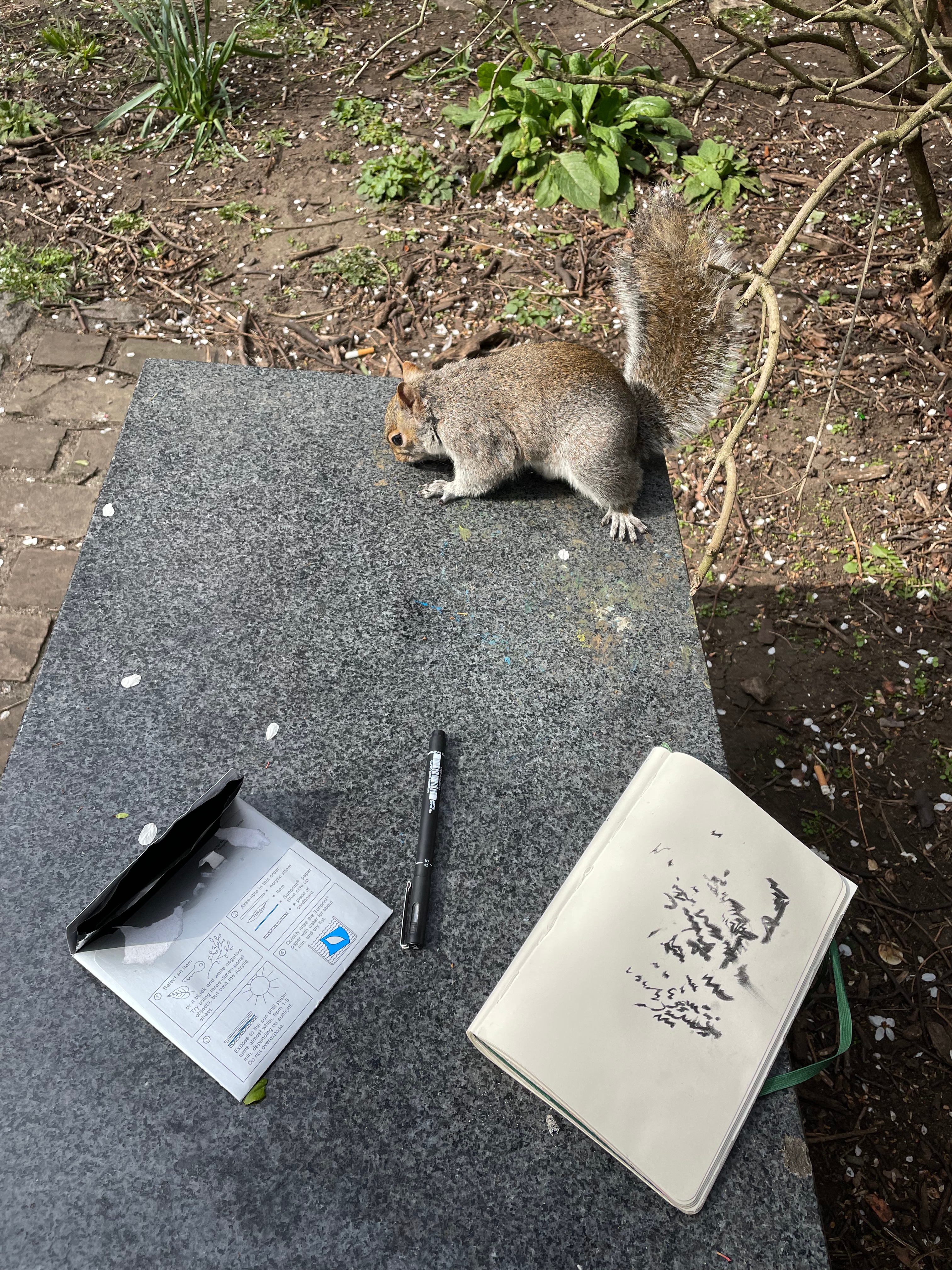 I sadly missed Lucie Winterson’s first lecture due to illness, but I had been informed that her work with nature, and specifically waterfalls would really appeal to me. I was sadly a bit underwhelmed with Lucie’s process, of allowing pigment to dissolve over paper in a waterfall, as I was already coming the the realisation that my waterfall techniques were hard to develop further for me. I also disagreed with her discussion of ‘wild marks’. Lucie showed us a presentation full of other artists using these ‘wild marks’ but personally, I don’t think there is such thing as a ‘wild mark’ that is created by a person. I think that my own waterfall plates are nearly as close as you could get to a mark created solely by nature, as I had no control over creating them, the waterfall had ultimate control over the marks. But even then, there is a conscious choice by me, in how long they are etched for, how they should be inked, on what medium or substrate they should be printed on. All these conscious human choices immediately ‘de-wild’ the marks in my opinion. We were told to go to the local park and create some ‘wild-marks’. I remembered that I had some cyanotype paper in my draw that I’d been waiting to use for the right purpose. I decided that no mark I could make could be wild, and instead offered a canvas for nature to create its own marks. I situated these papers around the park, under bushes, in holes in trees, etc, and allowed nature to make an impression onto them. For me, nature’s mark is breathy and ethereal, it cannot be felt or captured by a human hand and translated onto medium. While my prints were developing under the sun, I decided to close my eyes and record the bird song (middle image). I found it funny that when I opened my eyes, I could differentiate between the long caws of jackdaws and crows that I had recorded, and the more subtle chattering of robins and tits. I think that the way I created my wild marks, especially in the sun prints, were a lot more authentic than the ones Lucie showed us.