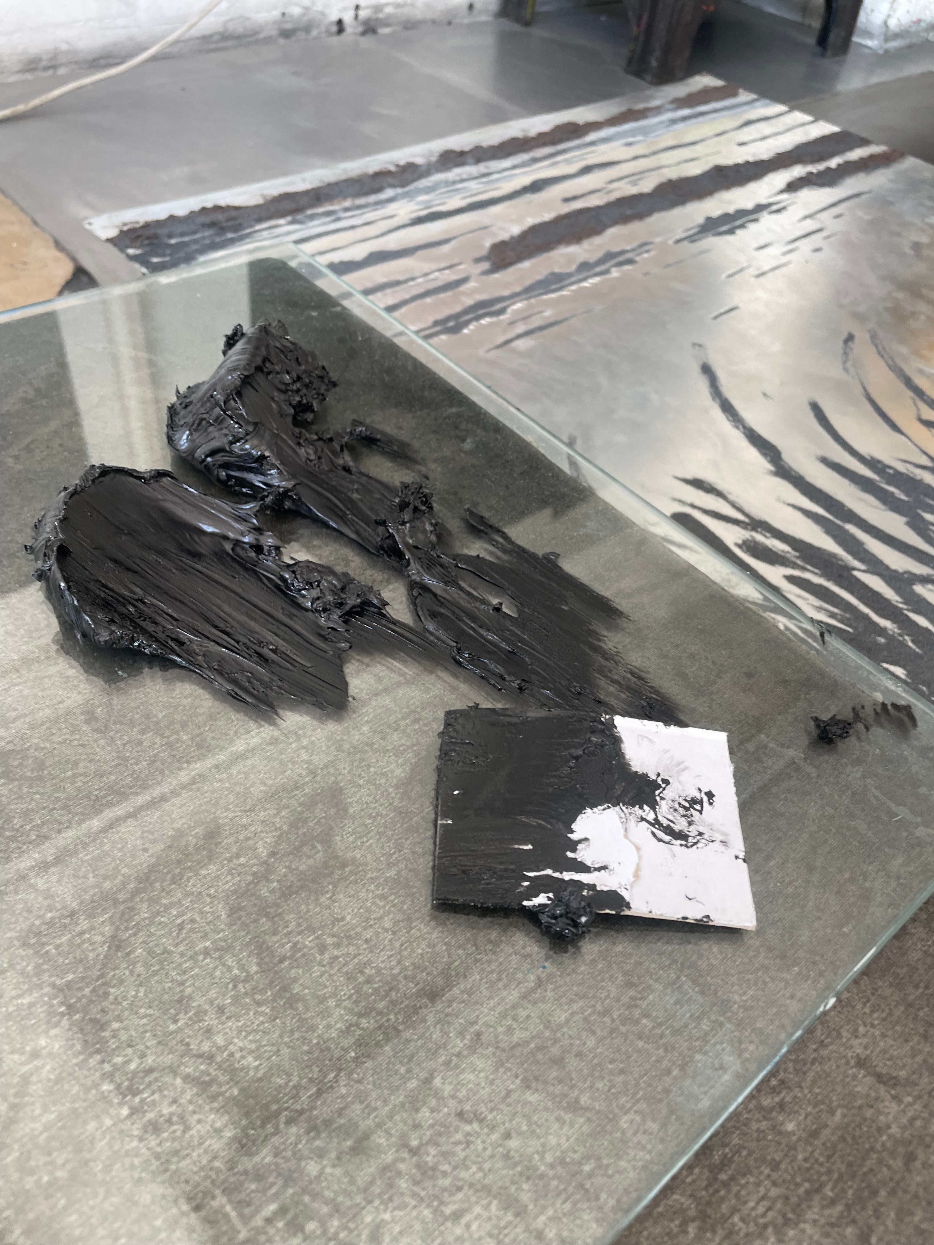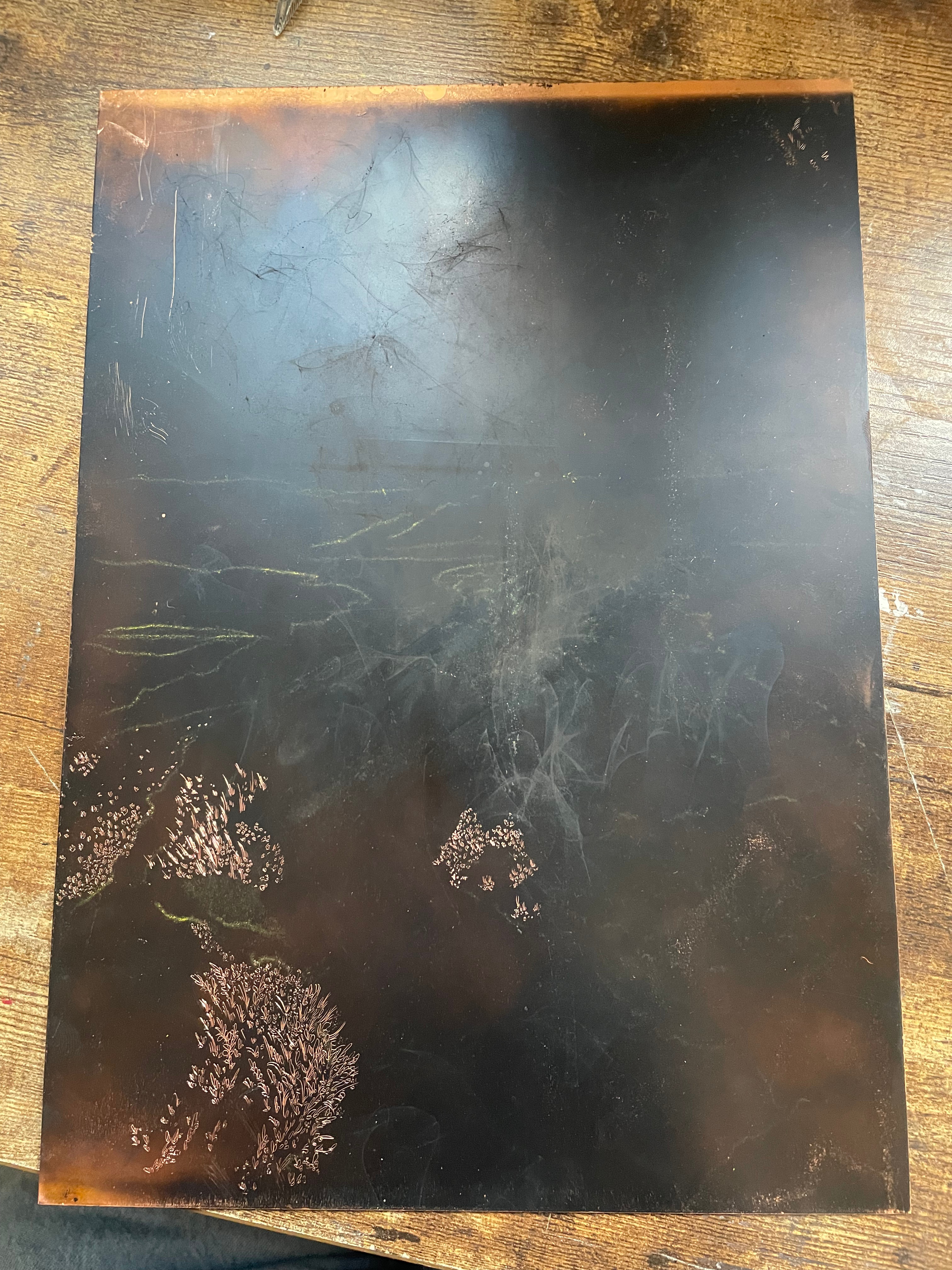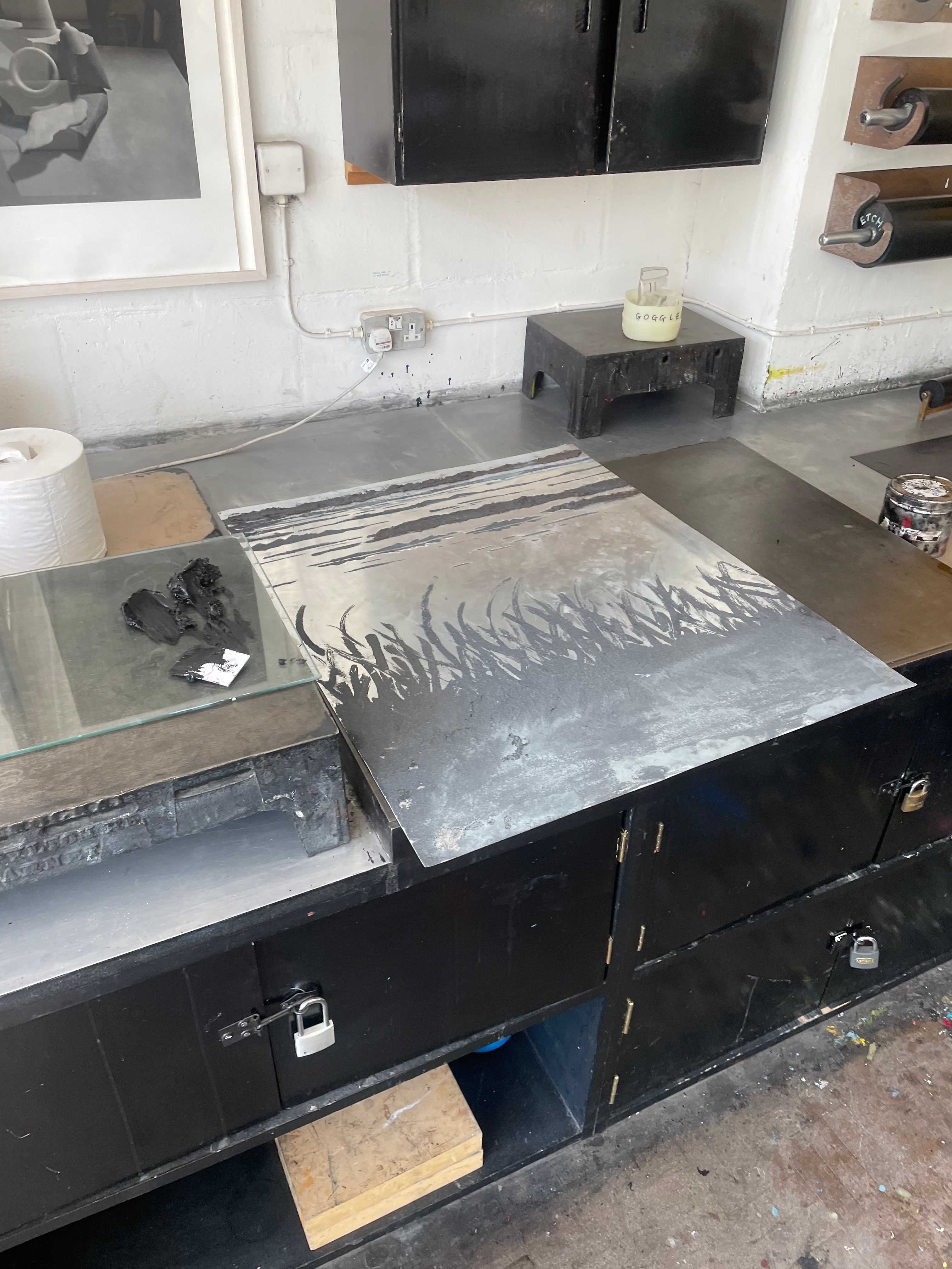I began to create a draft for the work I wanted to submit as my piece for the MA degree show, due to its size, I knew I had to begin testing and trialling the imagery and the work now, just to pre-empt the fact that things are most definitely going to go wrong at this scale, which they obviously did. I began by creating large scale sketches for the carborundum elements of the print, I chose two compositions from my photographs in Norfolk that I thought would be beautiful at a large scale. I slowly took over our studio with these sketches and was happy with seeing the work at the full scale of the print that would be made. I decided that the whole piece wouldn’t be carborundum based, and that I would use a large scale mono print as the background, to really accentuate the beautiful skies that I love adding into my work, and their reflection in the glassy waters of the high tide. The idea was that the top plates would be the sky, while the lower three plates would be the same sky, reflected back onto itself. I was really happy with this upper area of the image and thought that I had achieved the effect of those huge cosmic sunsets over the salt marsh. The problem came in adding the carborundum for a multitude of factors. The first factor that made this test unsuccessful was the fact that I used Charbonnel Doux ink, which I really really detest. It doesn’t have the same intensity as other Charbonnel etching inks, such as my favourite, 55985 black, and even in well-printed areas, really didn’t do much to make the carborundum sing. This brings me onto the second and third factors that really didn’t help the work. I wanted to ink the plates at the same time and print them together, however, I decided to do this on an excruciatingly hot day, and for the first time ever in my printmaking journey, I think the etching ink dried up on the plate, leading to the horrible patchy effect you can see in the print. The other factor was that the carborundum on the horizon line at the top of the plate was way too thick, meaning that the dry point impressions I’d made on the carborundum plates didn’t show up when printed, and this also took a lot of pressure off the thinner areas of carborundum towards the grassy areas at the bottom of the plate. Finally, I think that the intensity of the carborundum, and the softness of the mono print just don’t sit well together, and feel like two separate, unmarried entities on the paper.