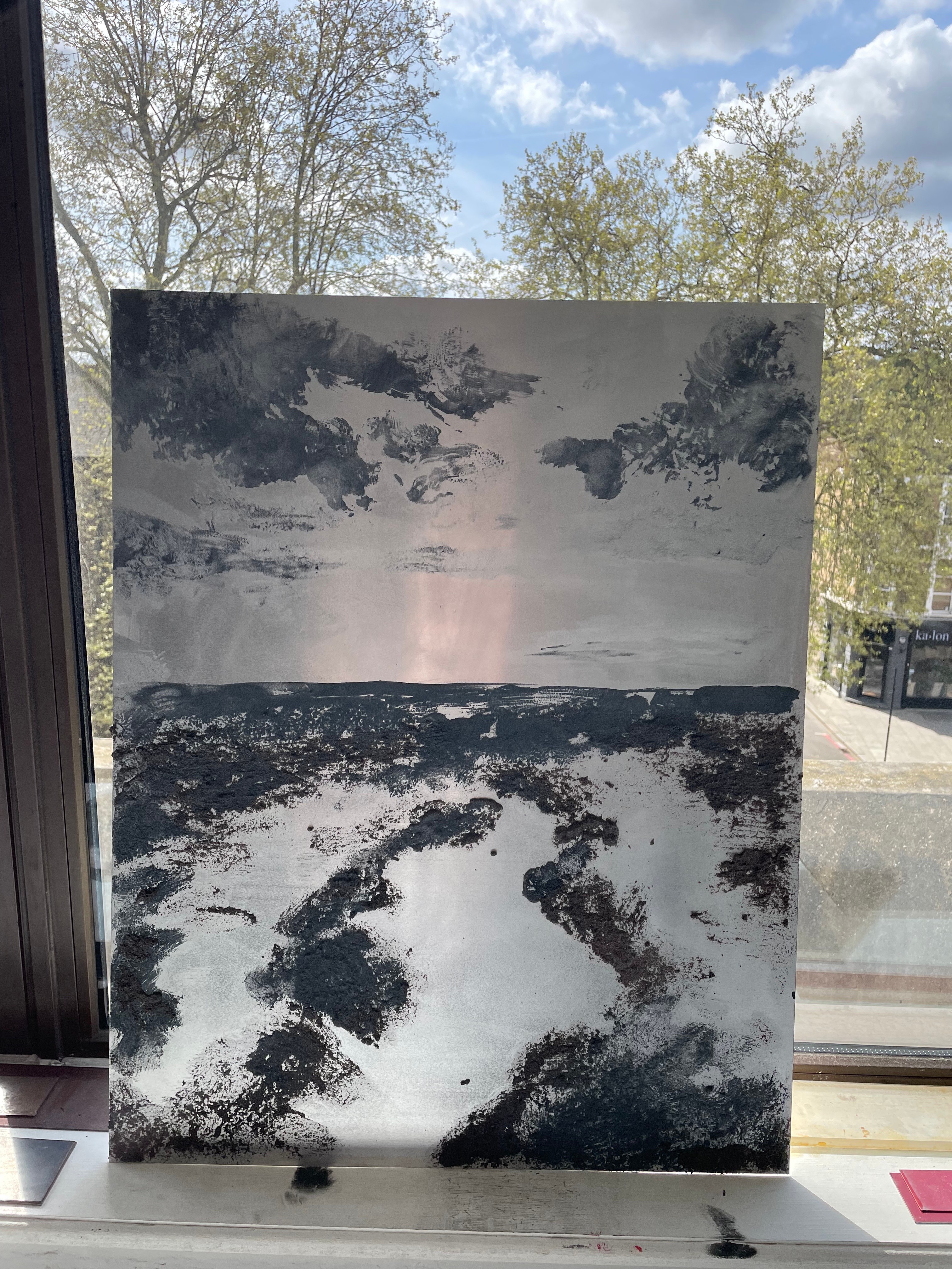 I created this piece in around 20 minutes for a small pop-up exhibition my group was holding in the MA and Staff bar at Camberwell. This piece for me encapsulates everything that I want to show in my work and its immediacy only supports this. As a result of creating this piece after the failure of the carborundum prints, and the success of the monoprinted background, I have decided that the carborundum isn’t what this degree show piece needs, and instead should take the form of a very large scale mono print on its own. I’m much happier with this decision and think that this new piece that I will create will be much more successful. the elements that work in this piece are simple, the encroaching darkness, and the small flashes of light in the clouds, horizon and water, that just subtly denote where the elements of the landscape sit, I can’t wait to take these large mono prints further.