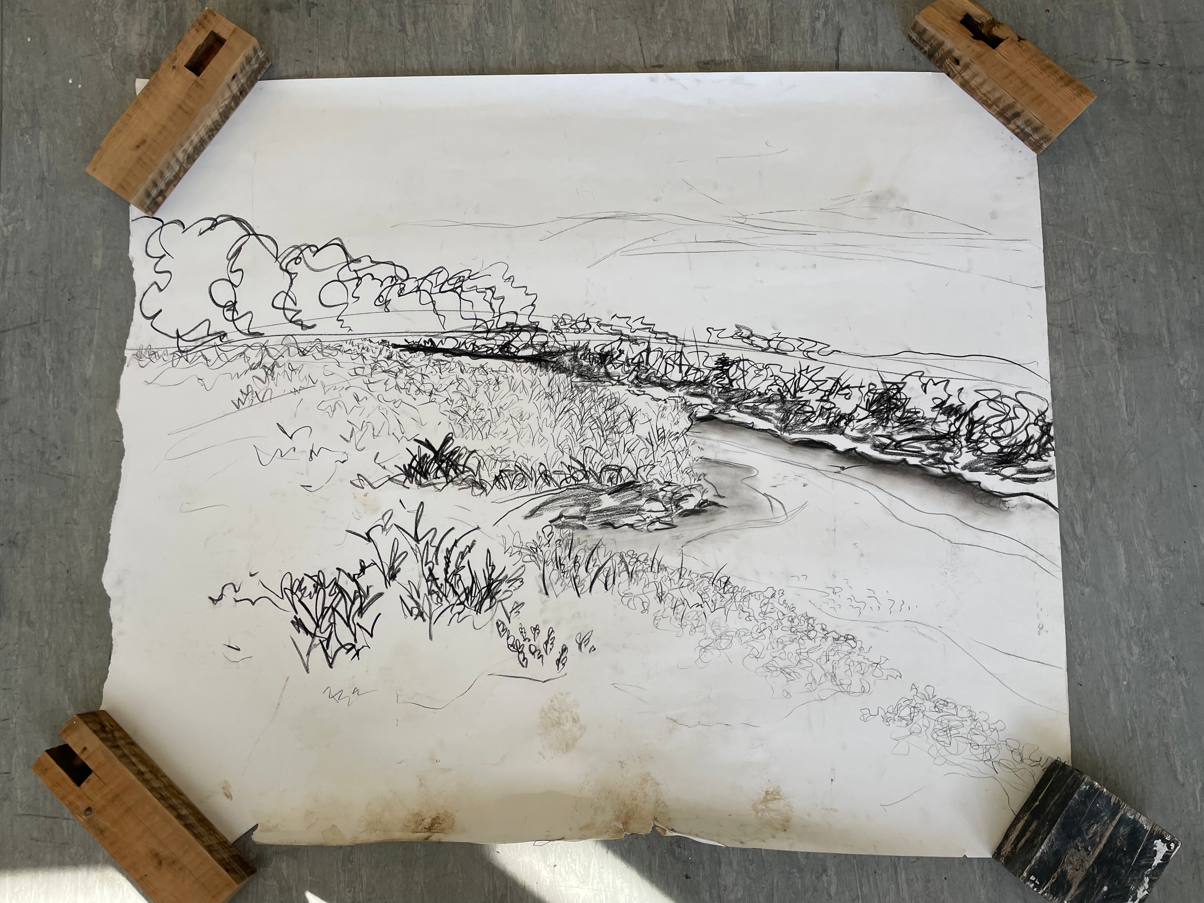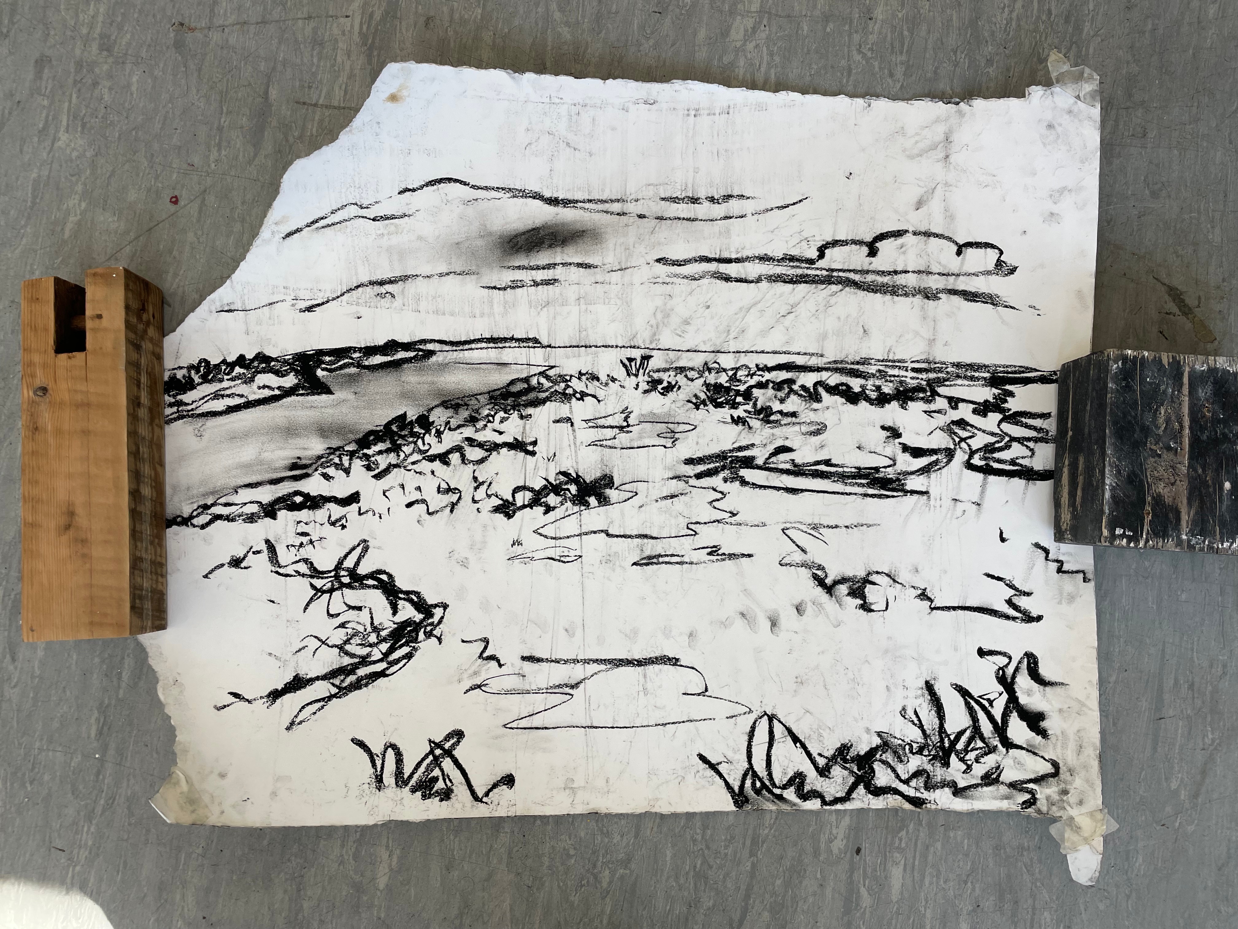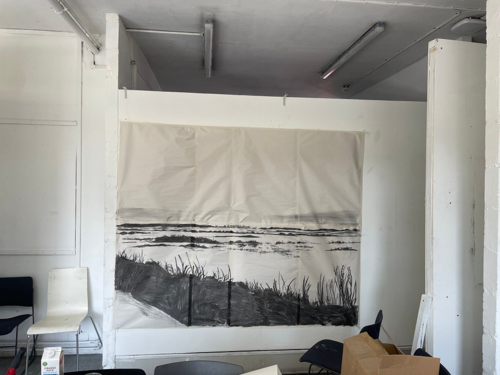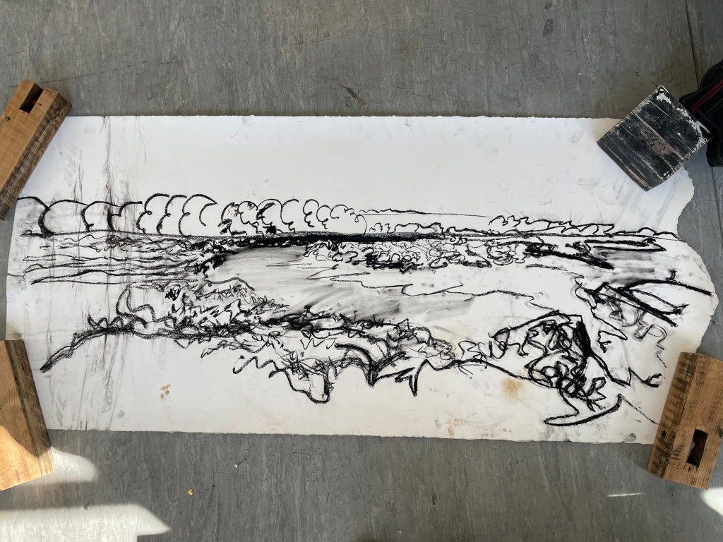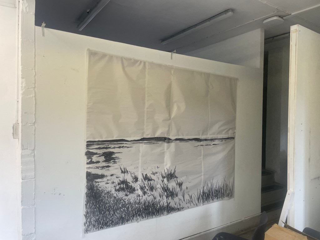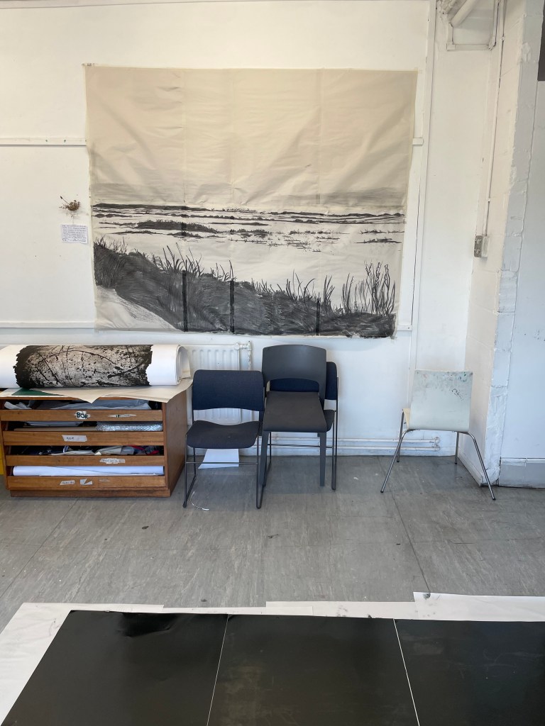 After presenting these carborundum prints in a crit, and explaining where my current body of work was going in respect to my feelings of loss about my dad, I was asked, “what’s the next step?”. The only answer for me is scale, I feel like my work is becoming more and more a reflection of myself and a portrait of the relationship between me and my father and the subsequent loss of it and I’m becoming more settled with the visual language that reflects this. Since I started creating monoprints, I was quickly forced out of my love for small work, I could only think about going bigger and bigger, to really envelop the viewer in the scene, to make them feel like they’re standing next to me, as I look out on the marshes. I think that the more visceral darkness within my work could only be developed and become more emotive at a much larger scale. As a result of this I decided for the degree show, I’d like to create a huge monoprint with carborundum overprinting. Although I have countless sketches of the marsh on a small scale, I realised that they would not be adequate to create these much larger pieces of work. So I set off on the train that weekend to Norfolk on a solo trip. I took with me various rolls of different sized paper, to try and capture a composition that would be suited to become a very large scale print. I was massively unprepared for the difficulty of using such large sheets of paper on the windy marshes and spent most of the time battling with the wind. I do love the freedom of drawing en plein air, the vibrancy and emotive qualities of my drawings really come out when faced with the interference of the wind, water, sun, etc. I was also on a massive time crunch due to the ridiculously high tides we were experiencing over the weekend I visited. There was a blood moon a few days before, meaning that the tide was rising to terrifying levels while I was working. Luckily I have enough knowledge of the marshes to know where to sit so the creeks didn’t come up around me and trap me. I was really happy with these compositional sketches and I’m very excited to blow them up to a larger scale and create prints from them.