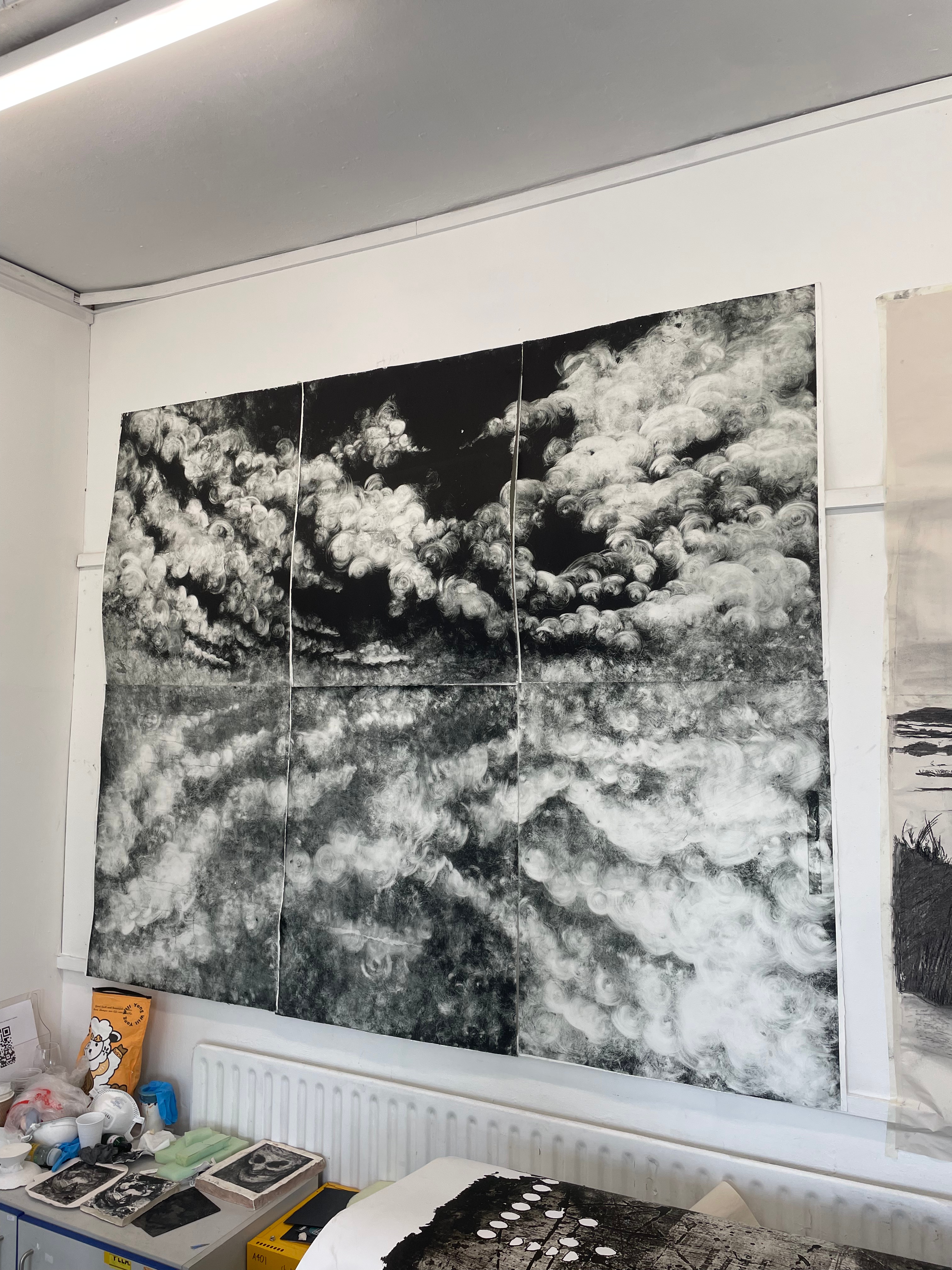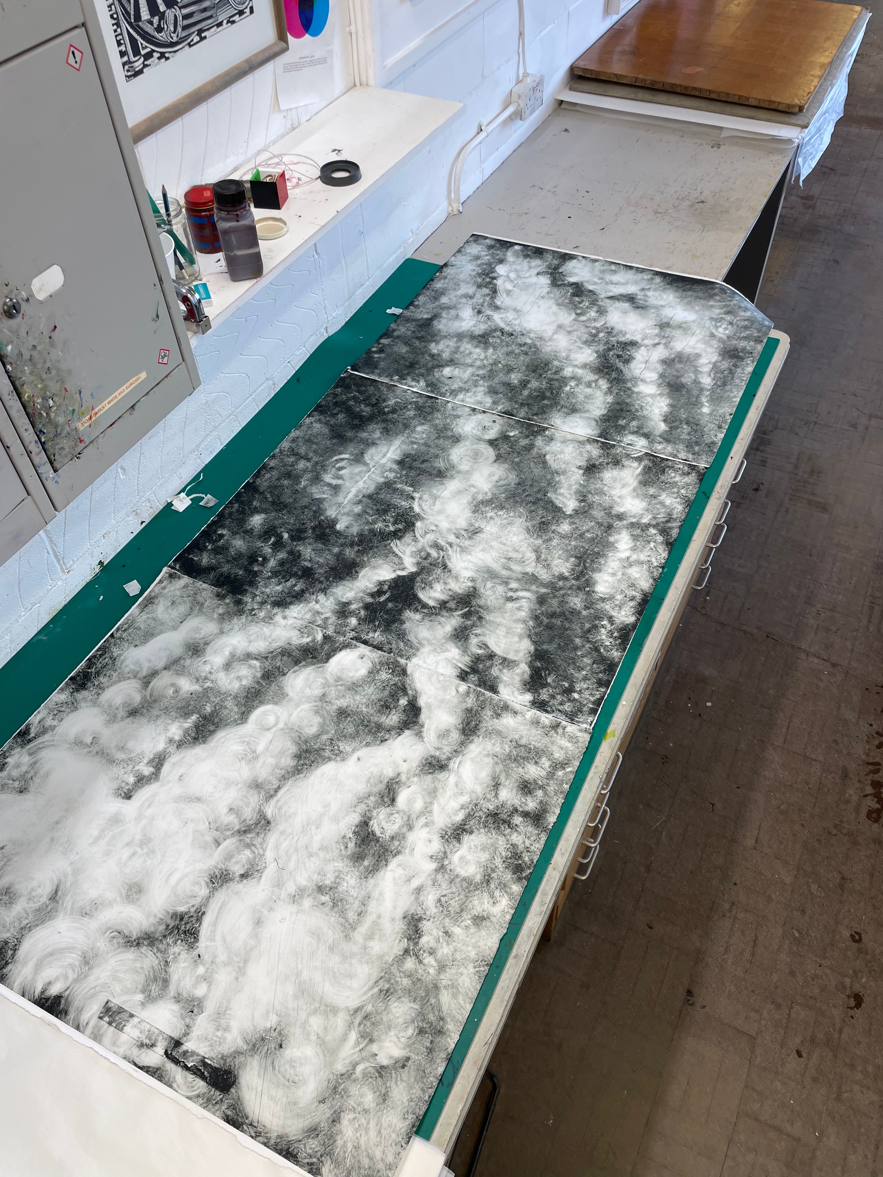After discussions with tutors, I began to realise that the crux of my images resided in the skies. The clouds have always been a really important way in which I show the elements of emotion and grief in my work and I began to realise that my landscapes were becoming vessels for the clouds. Although location is very important within my work, and the places I choose to work from hold a lot of emotional weight for me, by just focusing on the clouds, these works become universal declarations of grief. The clouds are also still drawn from and inspired by the sunsets over the moors, or over the marshes, but to the viewer, these clouds could harken back to their own special relationships with nature and the environment. Everybody remembers those early winter evenings, where the skies put on a show, pink-oranges and blush red scarlets bleeding from the heavens, and this universal experience of awe is what I wanted to try and feature in my work. I had some issues working at this scale in print, as obviously every section would have to be printed on its own, but would also have to make up a well-registered and coherent image. Finding the space to create these prints was difficult, as I always wanted to assemble the image as a whole, often working on inked up plates on the floor of the studio. I think that these images may have been more succesful if they were on one plate, with at least a few days working on each one. However, due to the drying time of the ink, and limitations in the uni studio opening times, I would have to ink up six aluminium photolithography plates, draw them and print them all in the same day. Although this led to a ridiculous amount of work being made in a short amount of time, I believe that the quality of the compositions suffered. Each plate felt like it’s own image, that had a relationship to the image next to it, but didn’t have much consideration to the plate on the opposite side of the composition. This did, however lead to some pairs or threes of plates working fantastically together. The first monoprints that I made earlier in the year that I added carborundum to have very different tonal qualities to the ones shown above this text. I believe that this is due to the weather. I couldn’t quite work out at first why the ink was acting differently, and not providing these lovely tonal varieties in shade when wiped as they had in the past, I then realised that due to the excessive heat and humidity, the ink was much less viscous, and easily wiped from the metal plates.
