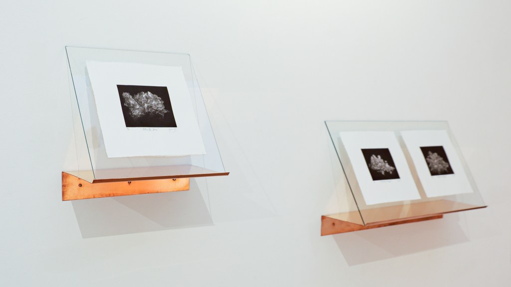 For the degree show, originally, I wanted these prints framed very classically and simplistically. I personally don’t really enjoy very complicated means of displaying pieces of art, or incorporating artworks into big installations. I wanted to keep the display of these pieces more simple in order to echo the classical nature of their medium. However. I had gone to large efforts to print these pieces on varying kinds of Japanese paper that really accentuated their floaty, ethereal nature, and as such, I felt a frame would enclose and solidify the work, and realised that I had to break free from the frame. I decided that the pieces should be shown floating on a thin sheet of glass, rather than trapped behind it. This way, the space behind the work would allow for light to be caught behind the glass and thin paper, and give these prints a subtle backlit luminosity. The print and the beautiful paper itself would be viewed in an unobstructed manner, to allow the delicacy of the image, and the substrate it is printed on to be admired with nothing detracting from it. I discussed various ways we could suspend this glass from the wall with technicians. Many ideas came out of these conversations, including white wooden dowels drilled into the wall, with a 45 degree cut in them to allow the glass to lean against the wall at the appropriate angle, but I wasn’t a big fan of this, as I felt the dowels would look cheap and heavy and take away from the delicacy of the prints. I then decided, if we couldn’t hide the suspension, then the other way of tackling the issue would be to make the suspension beautiful. I then began to think about a small shelf-lip of beautiful dark-stained wood that the glass would sit on similarly to the last idea. This also troubled me, as wood is Earthly and connotes being firmly rooted in the ground, it doesn’t encourage turning your eyes to the vast heavens. Finally, I decided that the only option that would satisfy me would be to construct a shelf out of a single sheet of folded copper. Copper is a strange material as like wood, it is also of Earthly descent, however, copper has ancient deep-rooted symbolism that would suggest otherwise. Copper is a beautiful, orange-toned lustrous metal that feels luxurious, it relates back to the genesis of these works themselves, meticulously being carved from a small sheet of copper. Copper is also one of the seven alchemical metals, and is attributed to the planet Venus, representing love, beauty and protection. Copper was used alchemically as it was believed that it could be transmuted into gold. Copper reflects the clouds I create, depicting transformation and change, while also providing a physical and heavy contrast to the floaty printwork.