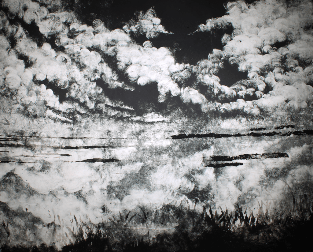 This piece was the more tonal section of the first set of monoprints I made. This selection has much more of an open, billowing mark than the later cloudscapes I produced that I really liked and just couldn’t manage to reproduce naturally due to the viscosity of the inks. The plates were also slightly dirty when making these clouds, leading to these really strange marks from splashes of gum from a previous life when these plates were being used for photolithography. These clouds really encompass that epic, Biblical power and awe that I always try and instil in my work.