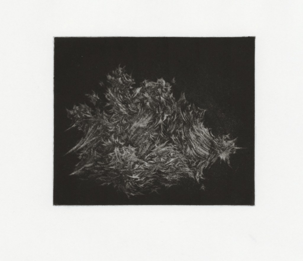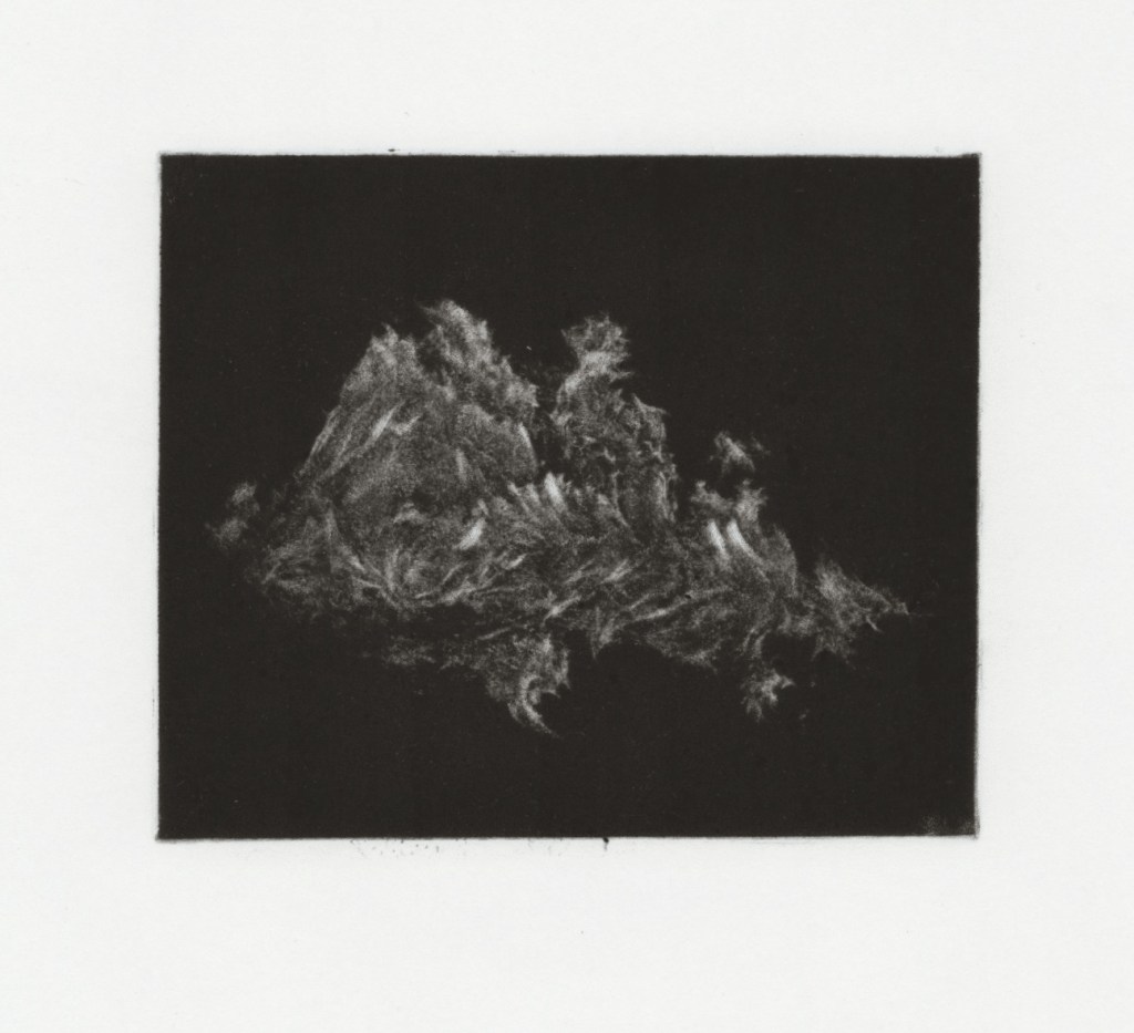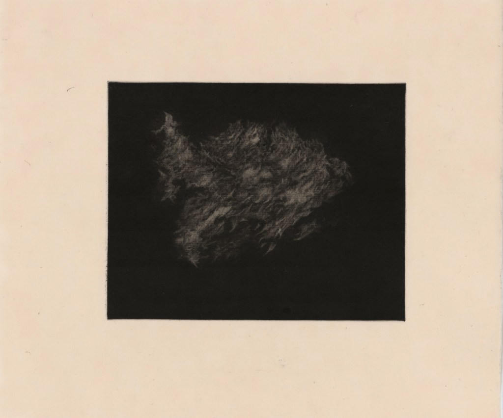 Mezzotint is a medium that I have always wanted the time to explore more. I had tried to create a couple of mezzotinted dogs on my BA to varying levels of success, but had the starting knowledge and tools to carry on experimenting and exploring. I chose mezzotint as it has a similar visual language to the monoprinted clouds, with softness emanating from an intense darkness, however had much more control in markmaking and tone, as well as naturally creating much smaller outcomes, which was something I had craved after working with the huge monoprints for so long. Working into copper mezzotint plates may be the most enjoyable surfaces I have ever worked with and I was reminded of this as soon as the first burnished mark went onto the plate. The copper is ablaze while working on it, and it made working from my reference images of dramatic clouds at sunset really natural. There is a meditative quality in working the copper, picking out natural shapes and forms in the material by following the guides of the reflections of light, oil and graphite on the plate. I was really happy with this first outcome after not attempting mezzotint for a year. Even after attempting many more mezzotints, this one is still one of my favourites, I was not scared of creating these larger, more billowing marks (probably as a response to coming straight away from making these similar marks on the larger monoprints. Like the monoprints, the actual subject matter of these plates are open to interpretation, and I would encourage the viewer to call them whatever it is that leaps out to them. I enjoyed my coursemates asking, “is it rocks in water?”, or “is there a dog in that bit?”. For me, these clouds become lonely vessels of grief and mourning, swollen with bitter rain and charged with violent static, eager to burst forth from it’s vaporous husk.