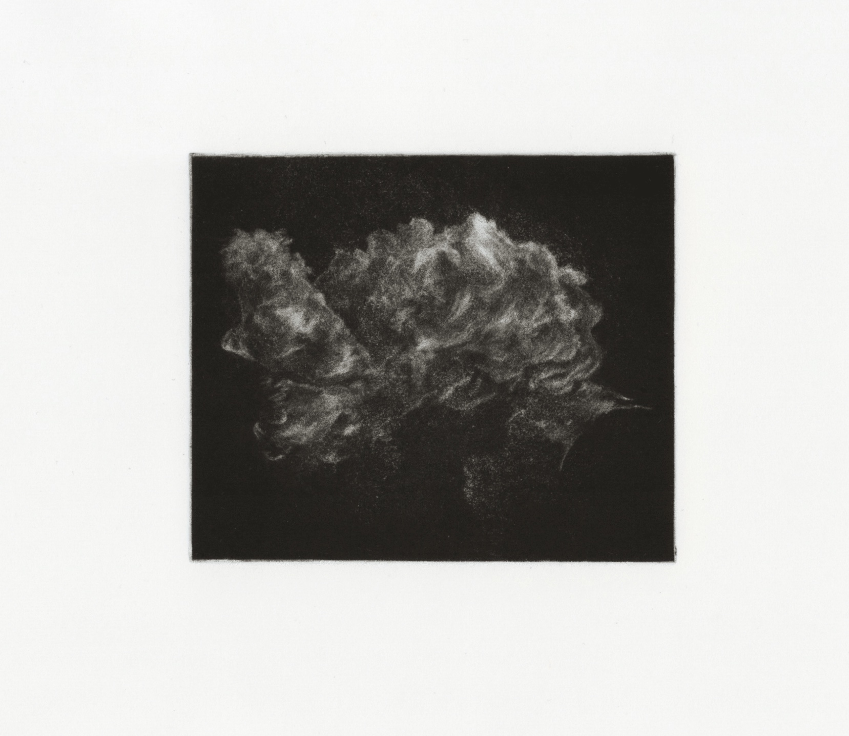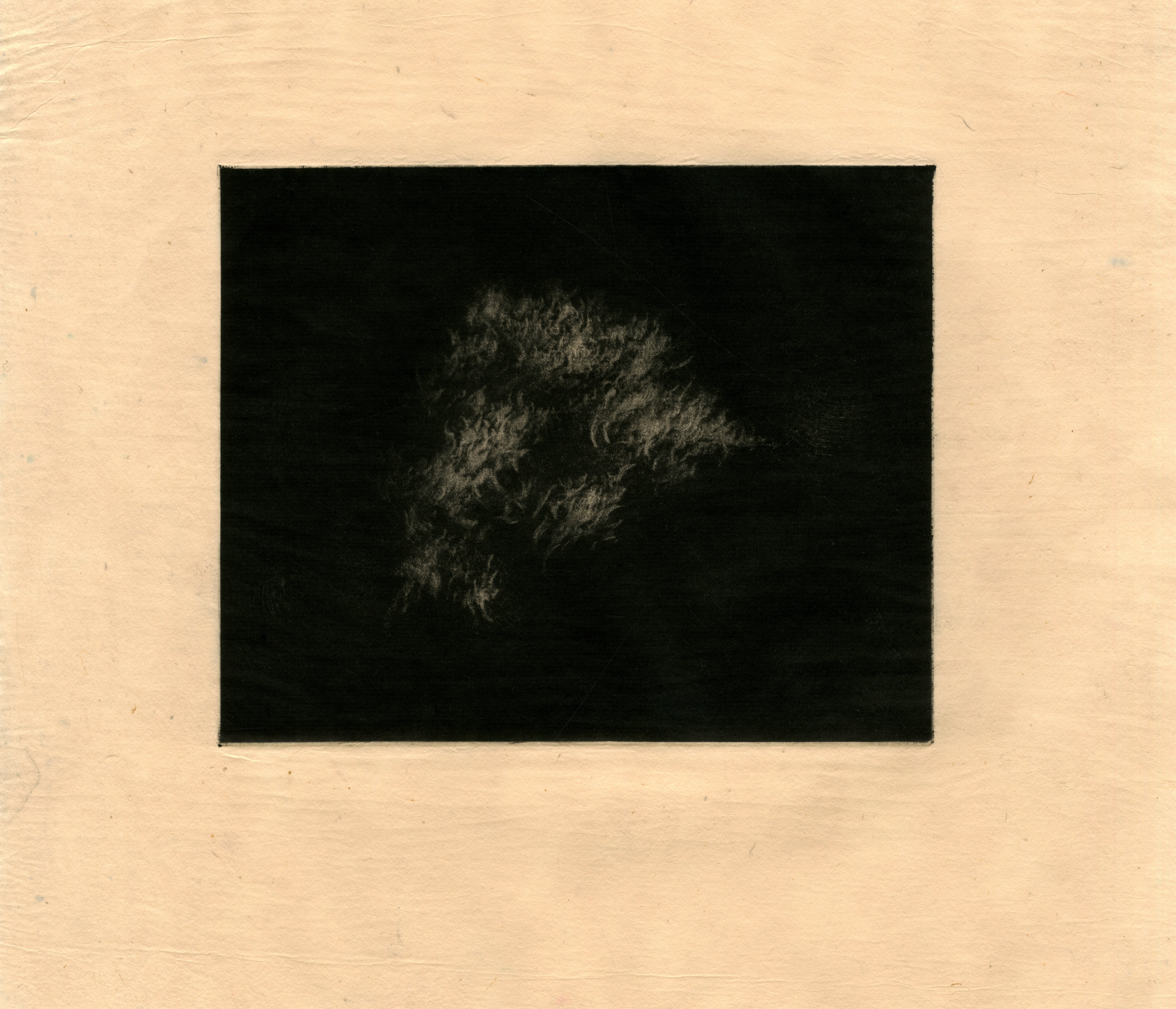 This piece was created on the zinc mezzotint plate. I only created a small cloud image on this plate just to test out what it could and could not do. I am excited to try and create more of these clouds at a larger scale, but I actually quite enjoy this one and the amount of negative space around it, the cloud really feels suspended in this abyssal void of the night sky. The zinc is interesting to work into, I found that this medium is in ways much less forgiving than traditional mezzotint, it is easily scraped back to white with one harsh scraper mark, and therefore you must be very gentle with your mark-making. I also found that the zinc is so soft that a burnisher is almost not required, at least in the making of my clouds, a soft scratch from the long side of a scraper really flattens out tone nicely. For some reason that I do not understand, this process blunts your scraper like nothing else I have seen, you would think that because zinc is softer than copper this would be the opposite and your tools should stay sharp forever, but this is not the case. I have had to sharpen my scrapers probably 4 or 5 times in the making of every one of these zinc mezzotint clouds, but a small price to pay for the hours of rocking that is missed due to this. As previously mentioned, the wiping of prints made in this process is quite alien. The whole plate should be very gently and easily scrimmed and then the image must be picked out very selectively by tissue wiping. You must leave almost so much ink that you can only barely see the image on the plate before printing. After one or two prints of every plate, you begin to work out the intricacies of each cloud shape in the black and the printing becomes quite intuitive and much easier. Strangely, these plates also print fantastically on even the thinnest Japanese papers and tissues, whereas on traditional mezzotinted plates, I believe the deeper tooth in the metal caught onto the fibres in the paper, resulting in a patchy and furry print. Overall, this method is really handy in creating many mezzotints very quickly, and personally I don’t see any difference in the quality of the outcome and mark-making, this process also excites me a lot, as it makes printing and making mezzotints once the course has finished and access to the studios has stopped much more accessible.