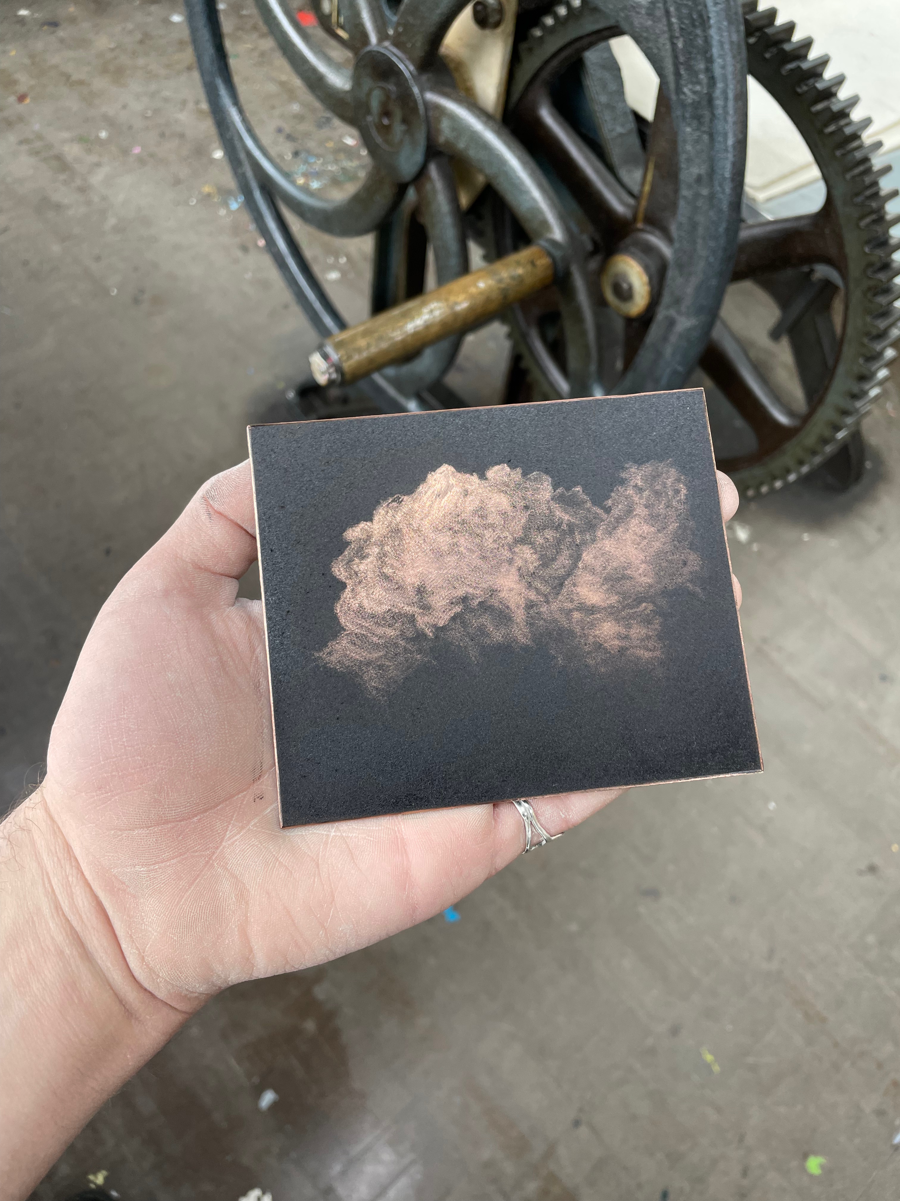 I managed to get my hands on some of the last Somerset Velvet Black available from John Purcell due to issues in manufacturing. I was really interested to see how my clouds would print on this black paper, after seeing a series of white line etchings of clouds on black paper created by Ian Malhotra at the Somerset House print fair. It’s interesting to note that on black paper these mezzotints become inverted, and I think this really adds to that weird insectoid, infected feeling they have. I’m not happy with this image as a resolved work, but I am excited to try to create some mezzotints with the intention of them being on black paper and inverted. Since seeing the first cloud inked on the copper plate, there’s really something exciting about getting that metallic almost fiery copper tone into the print on paper. After the handin, I intend on printing my cloud mezzotints on very thin Japanese tissue, before screen printing a square of gold size onto the black paper and applying copper leaf, and then chine-collé-ing these prints onto the copper-leafed paper. I’m hoping with some experimentation, this will make the clouds appear as if they are lit from within, with this thunderous quality about them.