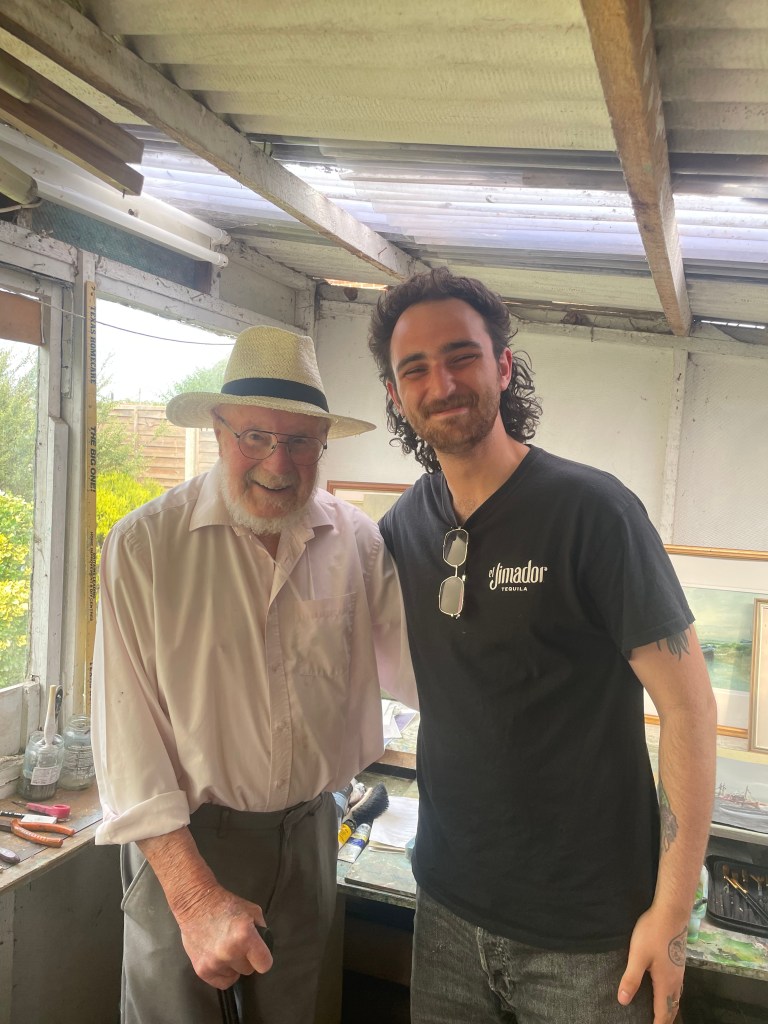 Over the Summer I went on another trip to Norfolk, this time armed with a pocket watercolour set and sketchbook. I wanted to take a step away from my usual moody works and try and capture some of the beautiful colours that the marshland has to offer at this time of year. I enjoyed creating these studies, and I found the joy in Constable’s ‘skying’, I think you can really see the weather and the time of day through these sketches. I do, however, really dislike the gaudy colours, mostly my fault in their mixing and selection, but partially due to a pretty sunny Summer. I think that the watercolours are not as penetrating as my oil based prints and I think that if I am to return to studying in paint, I would like to attempt to do some in-situ sketches with oils, which have a much thicker and more physical texture. I was also lucky to meet up with my Nana’s cousin, John Tuck, who I have spoken of before. John Tuck is an esteemed landscape painter, and had sadly stopped his painting a few days before my visit due to his failing eyesight (although he has done well to carry on as long as he has at the age of 99). John took a look at my sketches and gave me some nice feedback, mainly on my colours. It was inspiring as always to speak to John and I will always love having a look around his studio. Below is a picture of me and John on my last visit.
